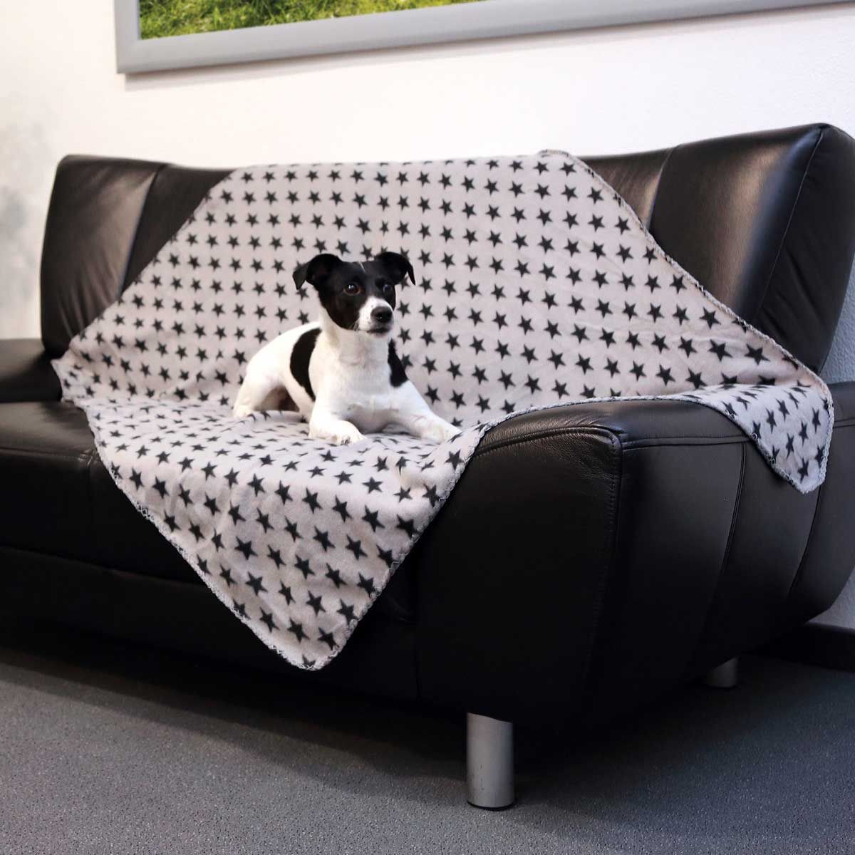 Hundfilten med stjärnmotiv är gjord av fleece och kan tvättas i 30°C. Den används för att skydda möbler mot hår och smuts och passar även på språng.
