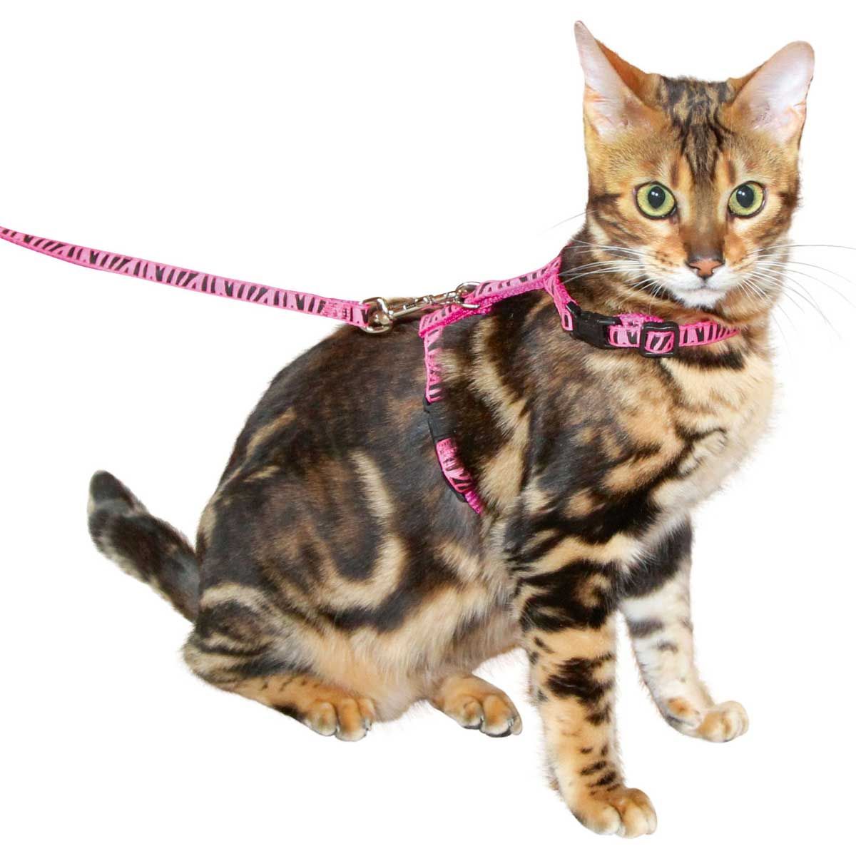 Det rosa kopplet är tillverkat av nylon med zebratryck. Kattselen stängs med klickförslutningar. Kopplet är 120 cm långt och 10 mm brett.