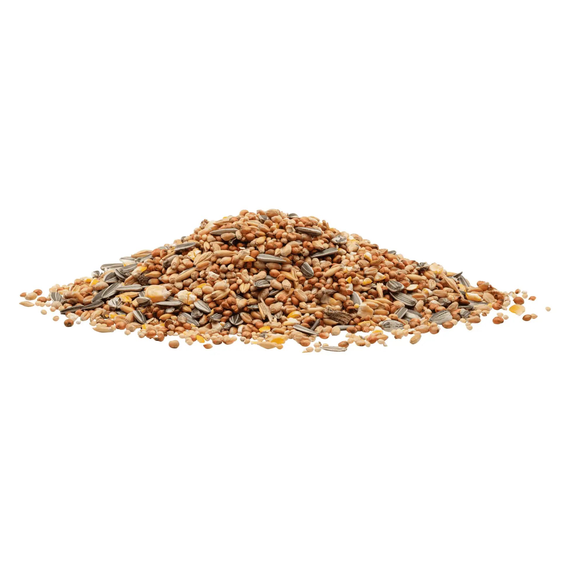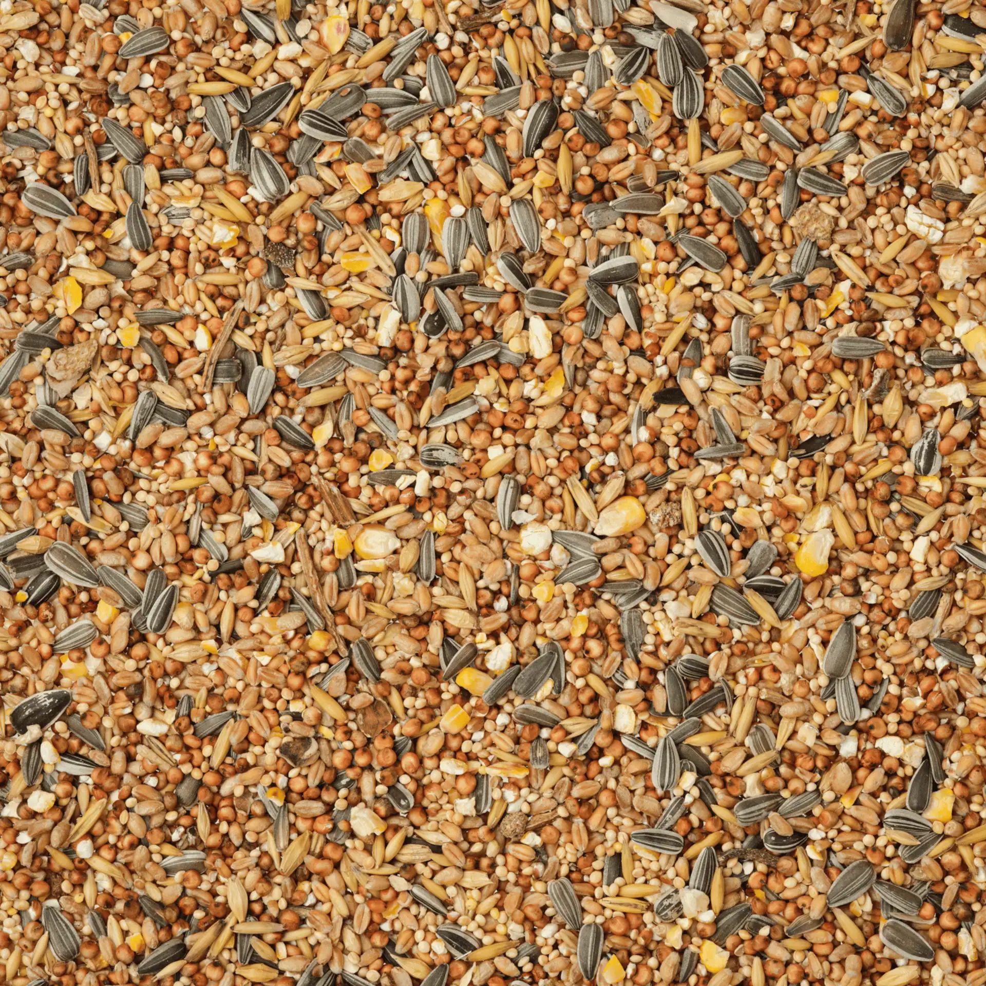 32,00 % milokorn, 25,00 % vete, 18,00 % gul hirs, 10,00 % randiga solrosfrön, 8,00 % havre, 7,00 % grovmald majs