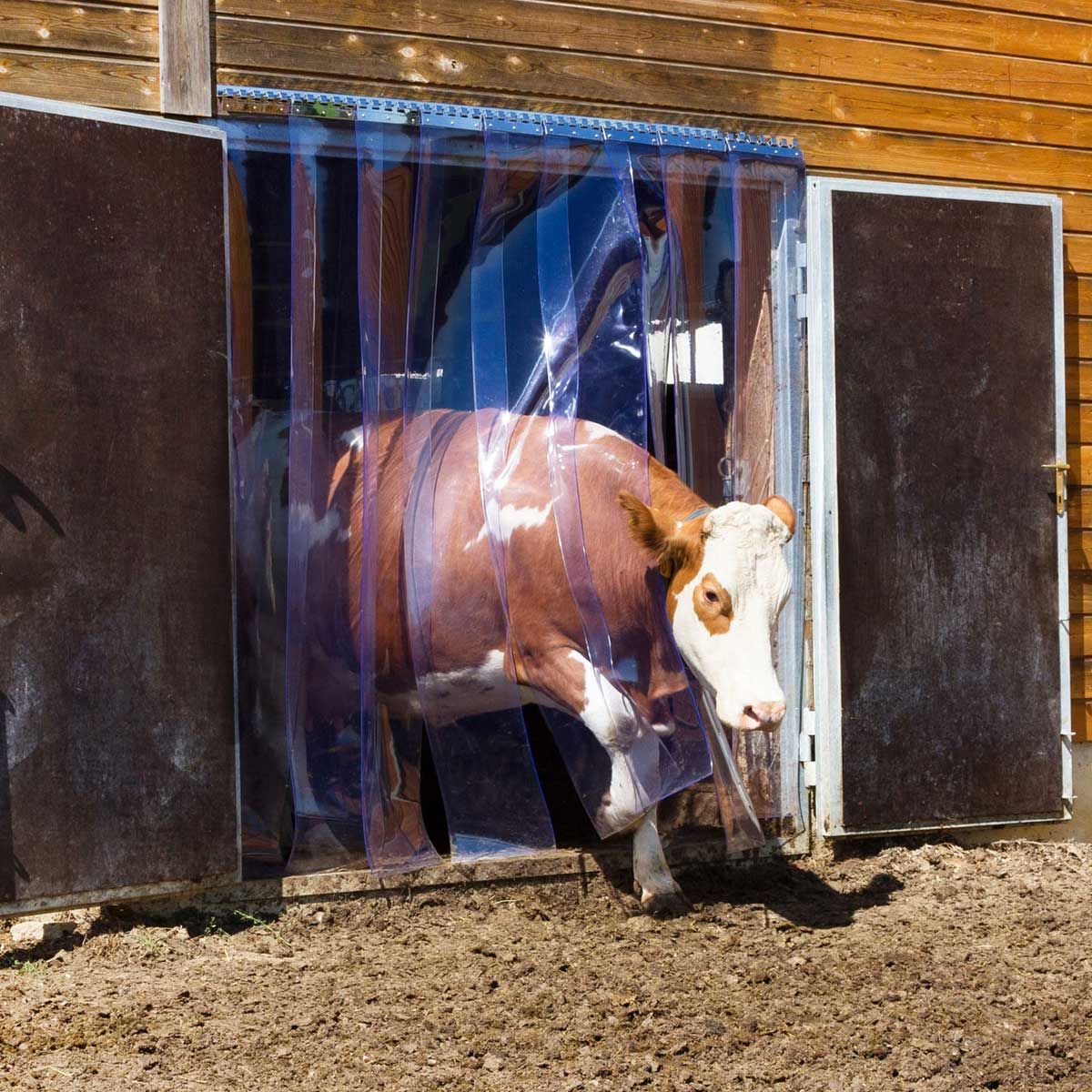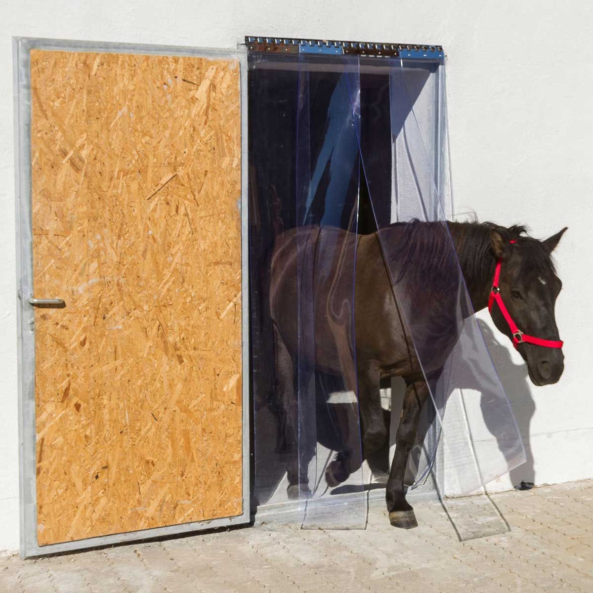Gardinuppsättningen med pvc-remsor ger optimalt skydd mot damm, stänk och ljud i miljöer med maskiner och utrustning. Dess mångsidighet gör den perfekt för hallar, stall och paddockar. Installationen är enkel och smidig med hjälp av kroklister och svängbara paneler.