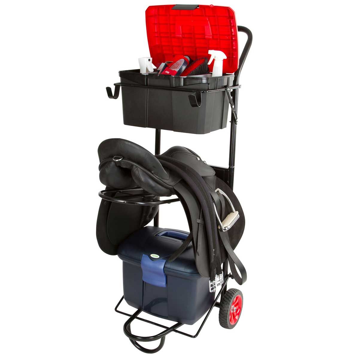 Den mobila sadelvagnen är en stabil sadelvagn av pulverlackerade metallrör som är perfekt för stallet, turneringen eller på vägen. Saddle caddy har en hållare för sadel, träns och groomingbox samt två krokar.