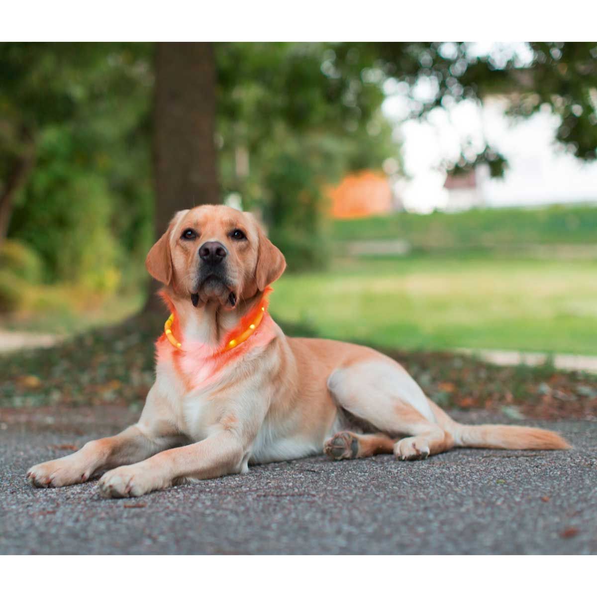 LED-kragen kan förkortas individuellt, är vattentät och synlig upp till 500 m. Du kan välja mellan två blinkningsnivåer eller kontinuerligt ljus. Ett uppladdningsbart batteri kan laddas med den medföljande USB-kabeln.