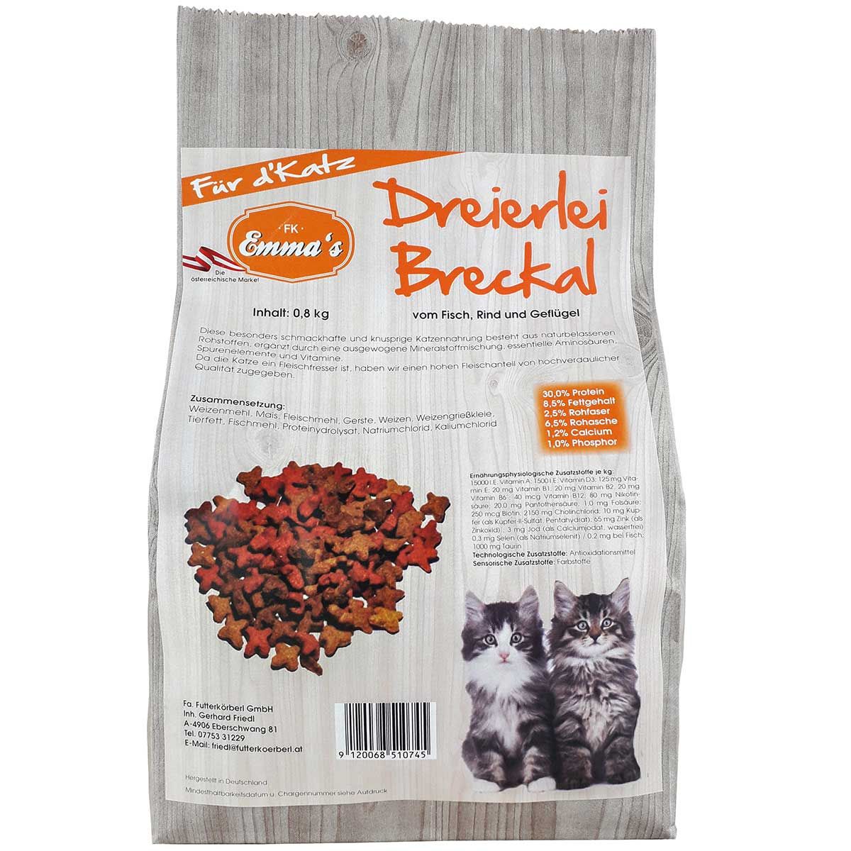Emmas Breckal Dreierlei Fish/Beef/Poultry är ett särskilt välsmakande och knaprigttorrfoder för katter