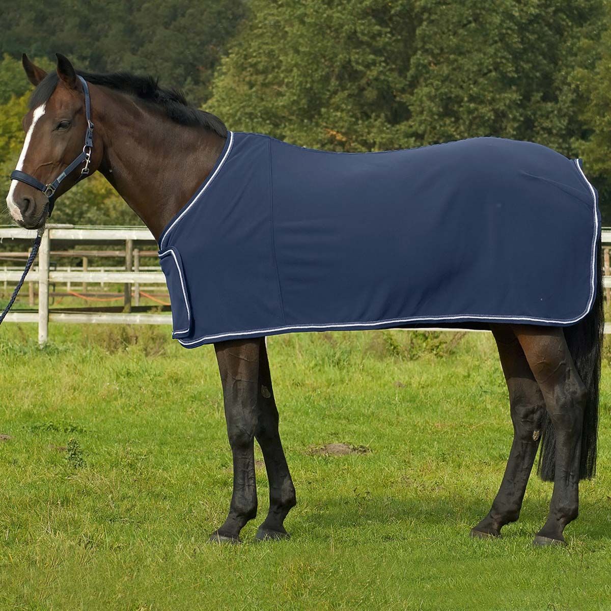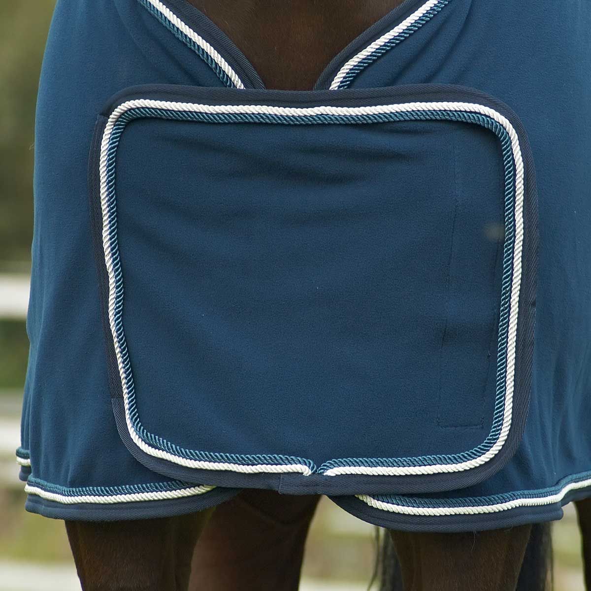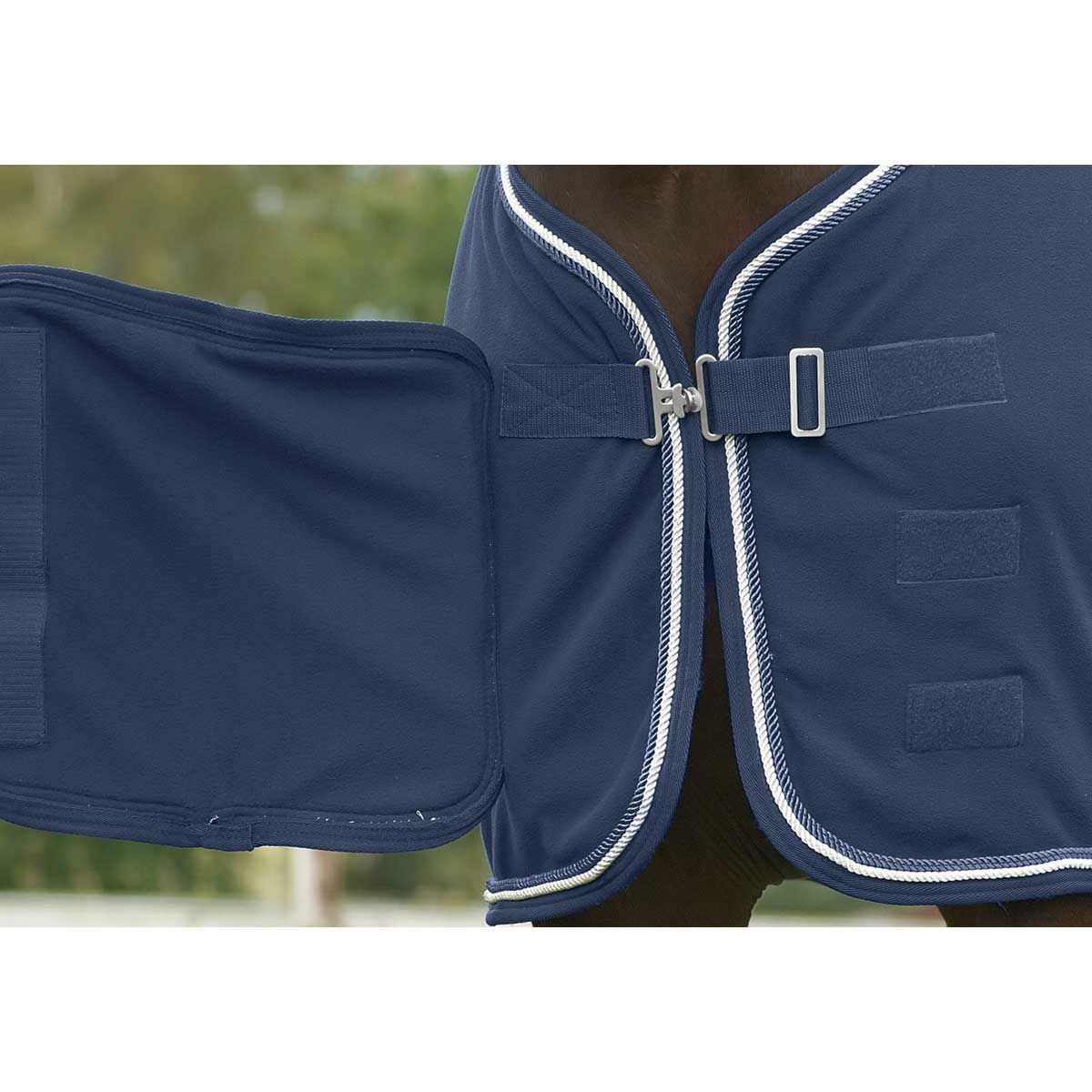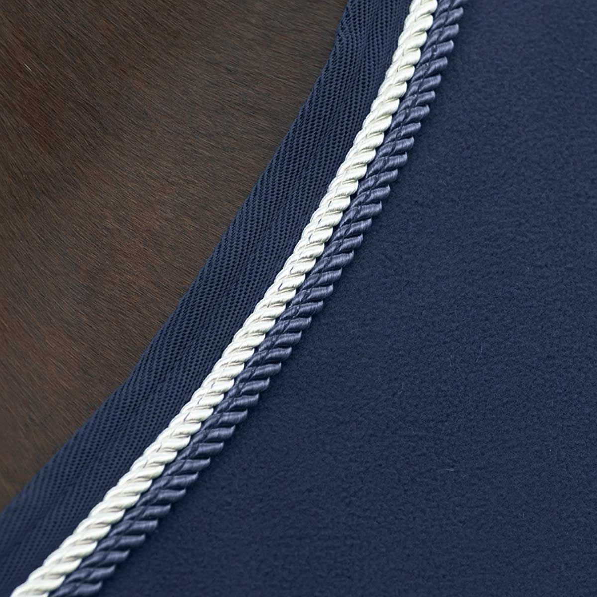 Den eleganta hästfilten PARADE från BUSSE är tillverkad av ett tungt fleecematerial av hög kvalitet. Den är idealisk som en elegant svett- och transportfilt. Det behagliga bomullsväffeltyget i bröstområdet, den centrala ryggsömmen och det generösa sidodjupet gör filten särskilt bekväm att bära. Ett mjukt skänkelkudde och det djupa bakre skänkelkuddet ger hästfilten den sista touchen. Den eleganta, allsidiga dubbelsnöret i vitt och marinblått, liksom bröstlapparna, som är idealiska för broderi, gör filten till ett absolut blickfång.