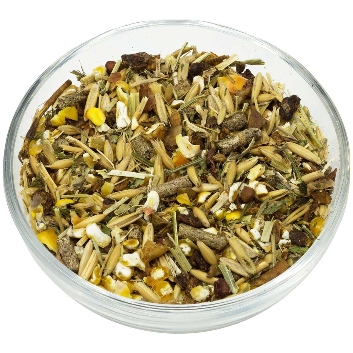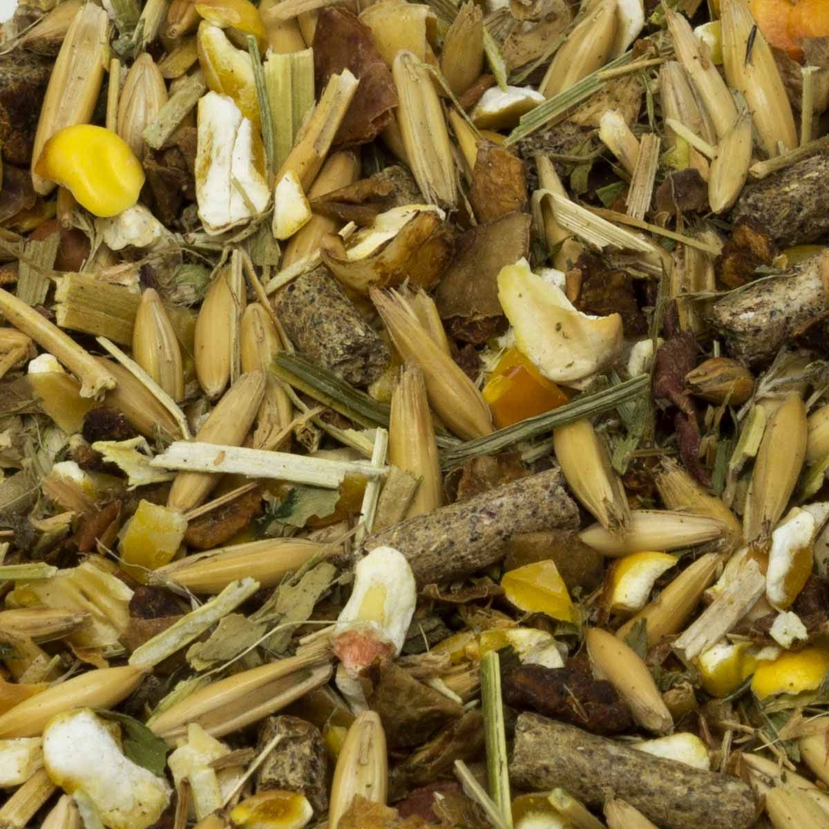 Havre, grovmalet majs, äppelrester, hackat lusernhö, sesamextraktionsmjöl, grovt vetekli, rapsextraktionsmjöl med pinne, monokalciumfosfat, grönmjöl, kalciumkarbonat, sojabönor, pumpafrönkaka, solrosolja, natriumklorid, melass, magnesiumoxid, öljäst
