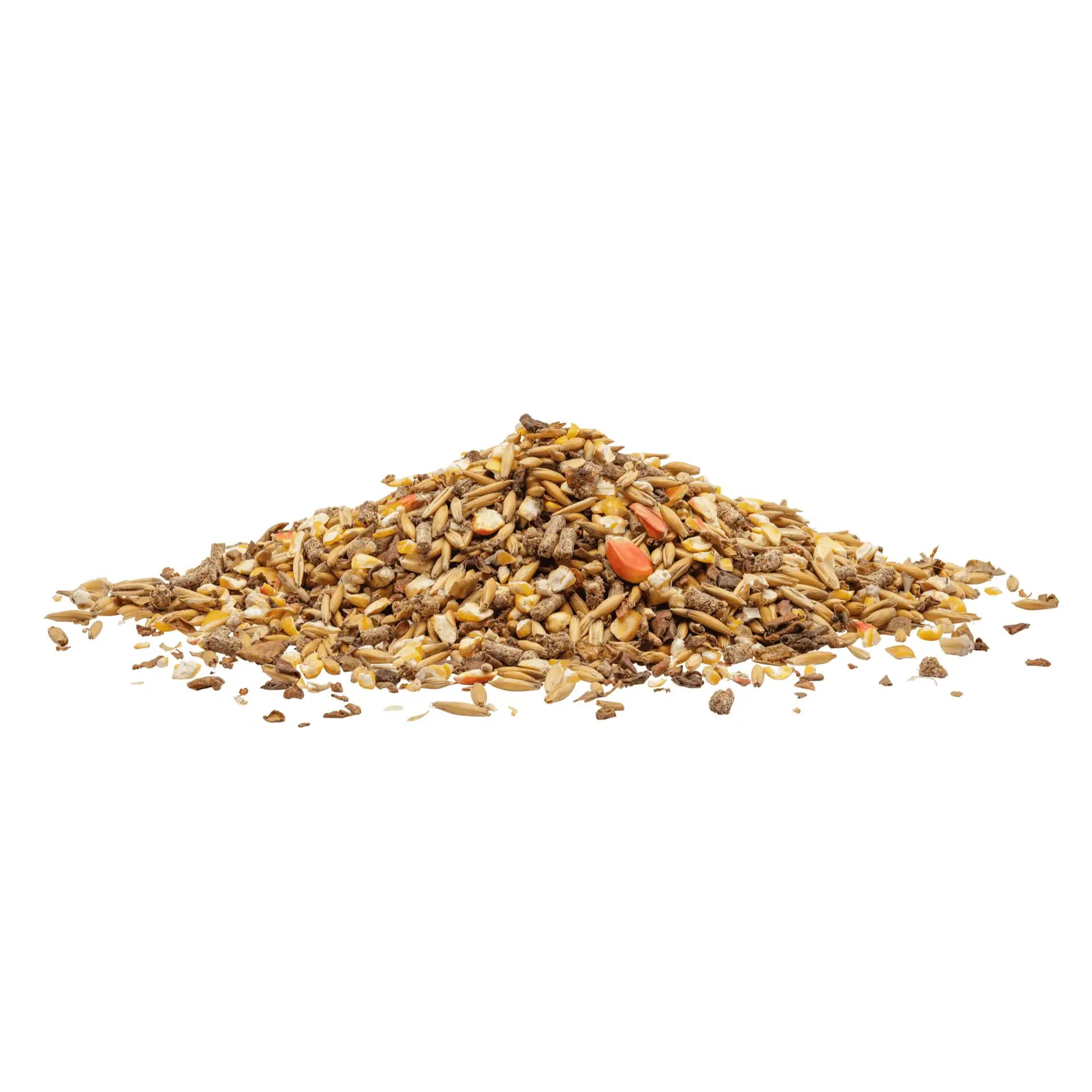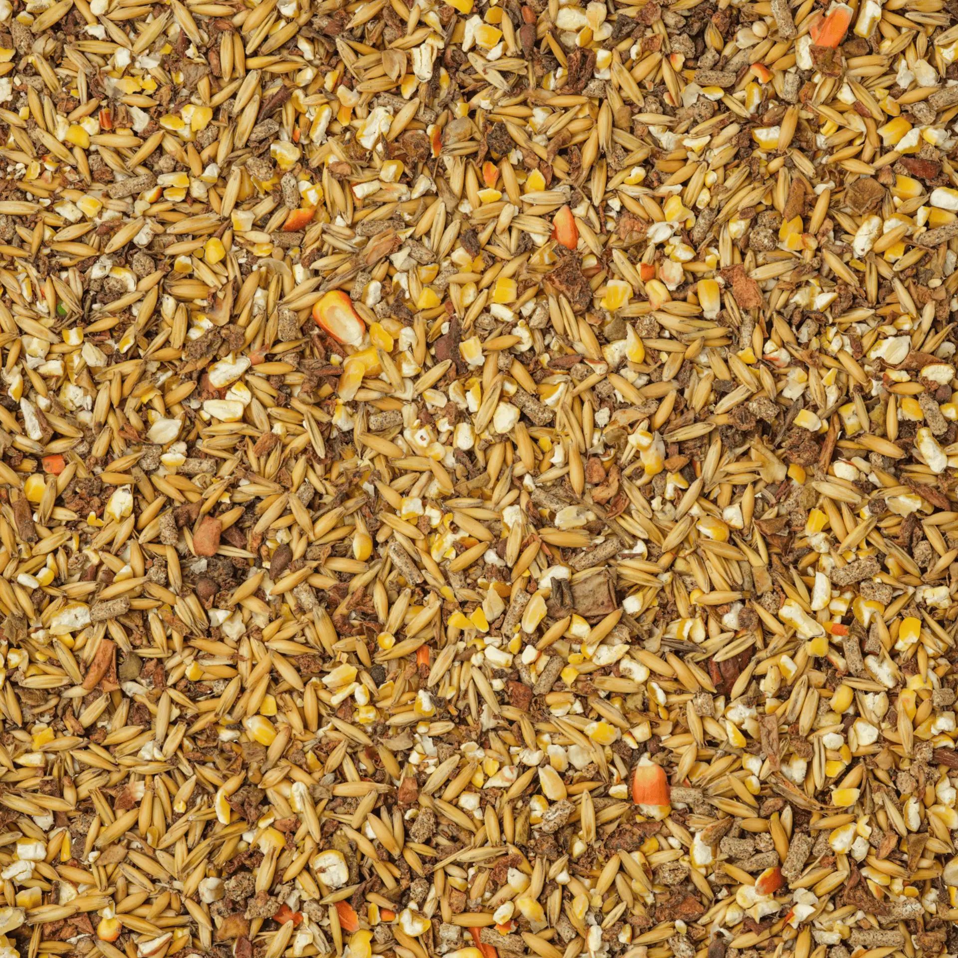 Grovmald majs, havre, äppelrester, extraktionsmjöl av soja (bönor) med såpstock (ånguppvärmd), extraktionsmjöl av sesam, extraktionsmjöl av raps med sockerrör, monokalciumfosfat, grönmjöl, kalciumkarbonat, sojabönor, pumpafrönkakaka, solrosolja, natriumklorid, melass, magnesiumoxid, bryggerijäst