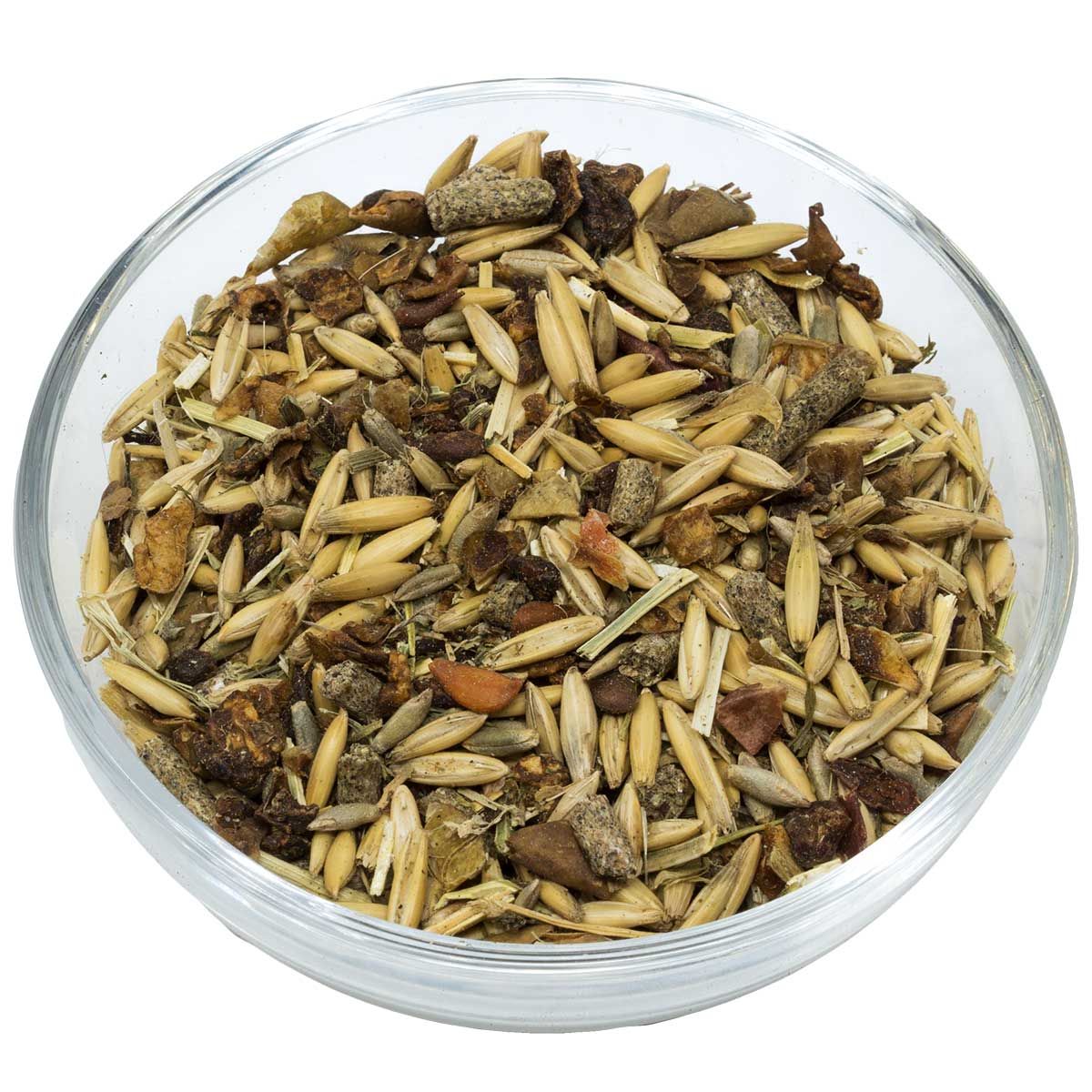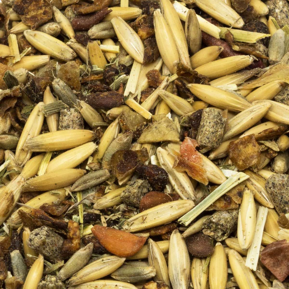 Havre, äppelrester, råg, lucernäring, sesamextraktionsmjöl, rapsextraktionsmjöl med pinne, morötter i tärningar, monokalciumfosfat, grönmjöl, kalciumkarbonat, sojabönor, pumpafrönkaka, solrosolja, melass, natriumklorid, magnesiumoxid, öljäst