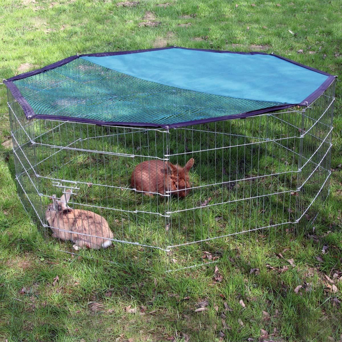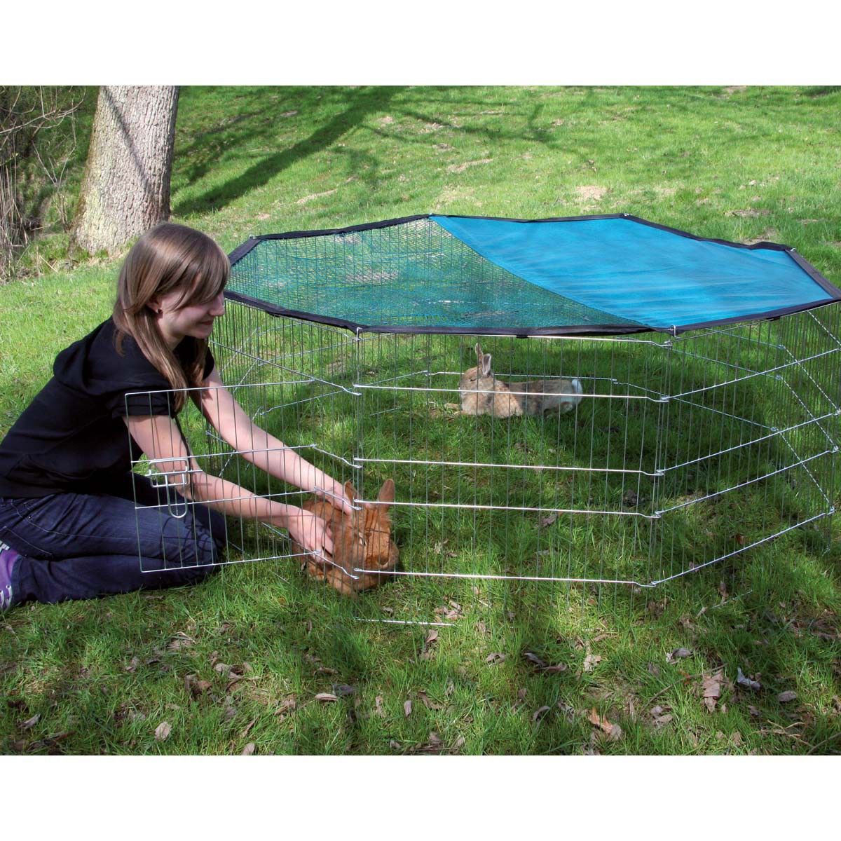 Detta praktiska utomhushägn består av 8 staketelement på 57 x 56 cm vardera. I leveransen ingår nät och integrerad solskydd.