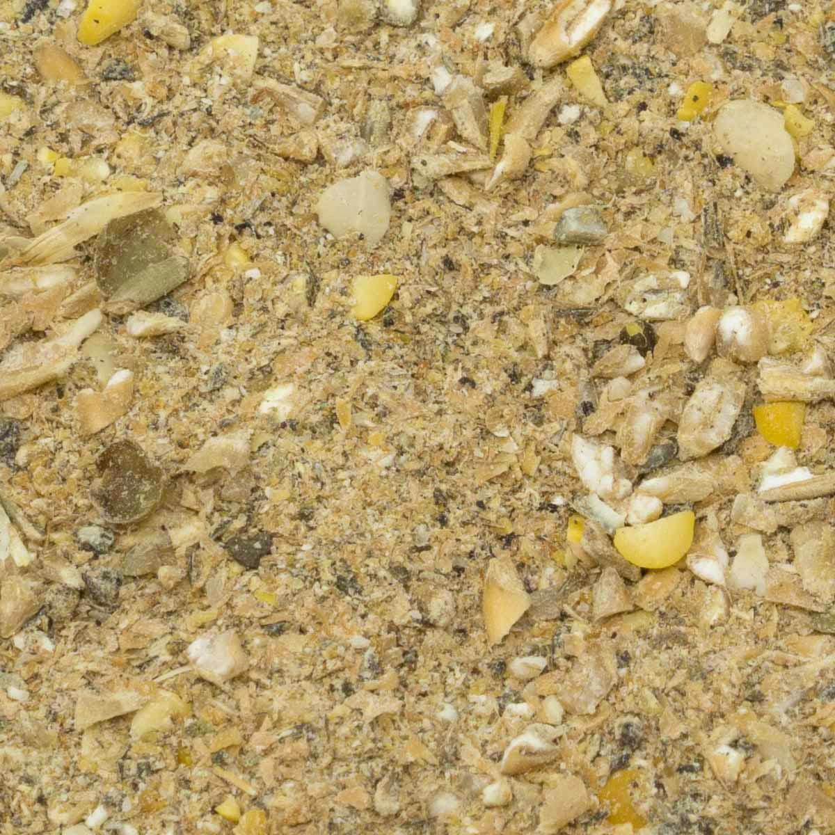 vete/triticale i varierande proportioner*, ärtor*, sojakaka*, solroskaka från delvis skalade frön*, vetekli i varierande proportioner*, korn*, åkerbönor*, havreflingor, ångade*, rapskaka 7-9, havre*, kalciumkarbonat, natriumklorid, monokalciumfosfat