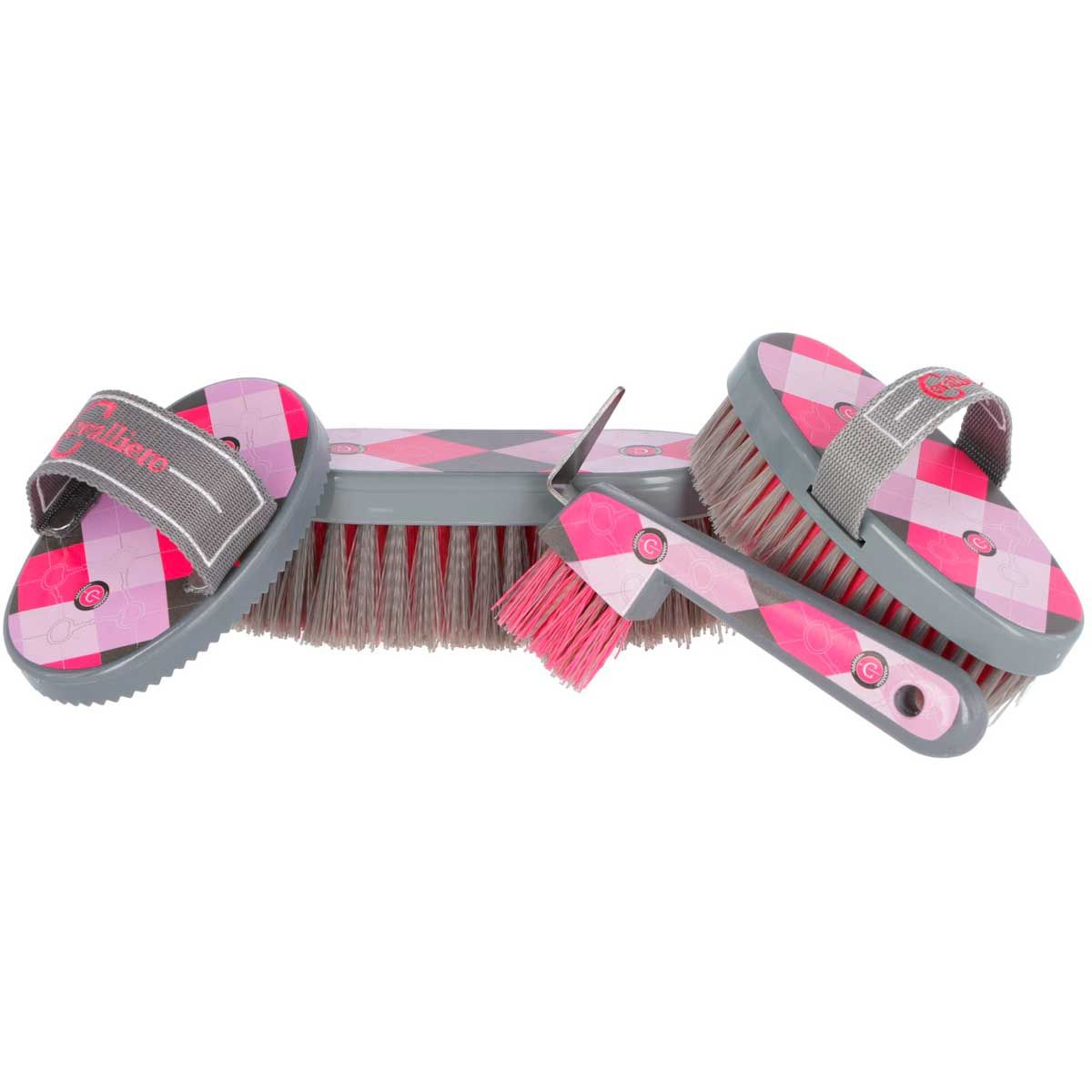 Den attraktiva sportväskan fylld med pälsrengöringsverktyg för hästar i trendig design är ett måste för varje IT-tjej. Hästvårdskitet innehåller en kamm i plast, en maneborste, en hästskötselborste och en hovskrapa.