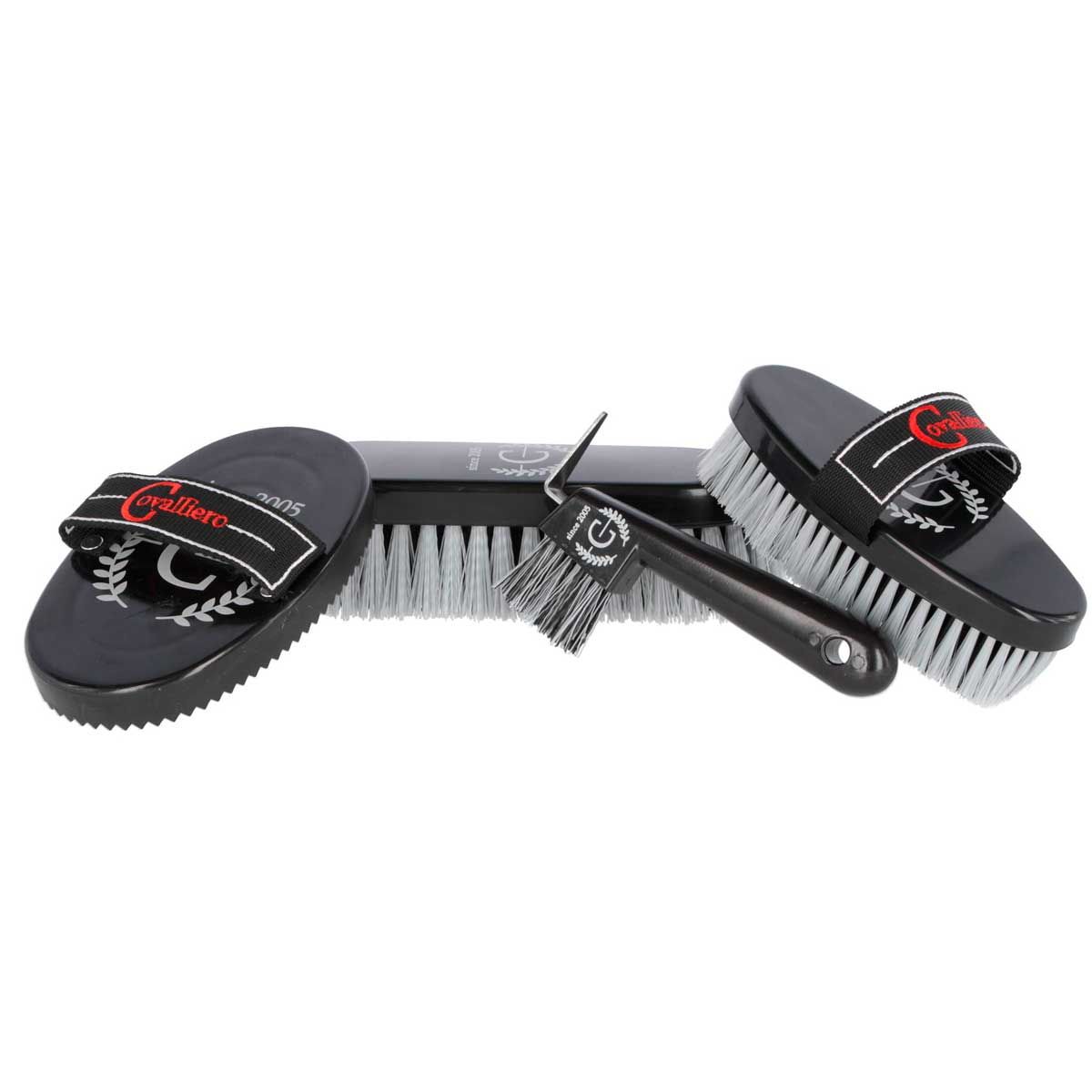 Currykam av plast, maneborste, hästskötselborste och hovskrapa