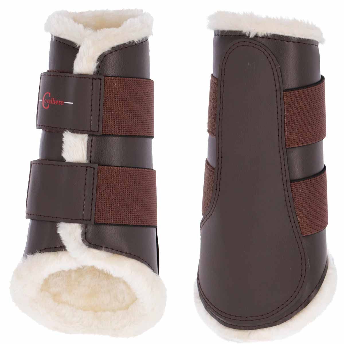 De robusta damaskerna från Covalliero är tillverkade av slitstarkt syntetiskt läder. De erbjuder optimalt skydd för leder och senor med ökad komfort tack vare den gosiga teddy fleecen på insidan. Damaskerna är stängda runt om och passar för fram- och bakben. De breda kardborreknäpparna med elastisk insats för variabel storleksjustering ger optimal fixering. Med de matchande hovklockorna blir du och din häst det absoluta blickfånget i stallet.