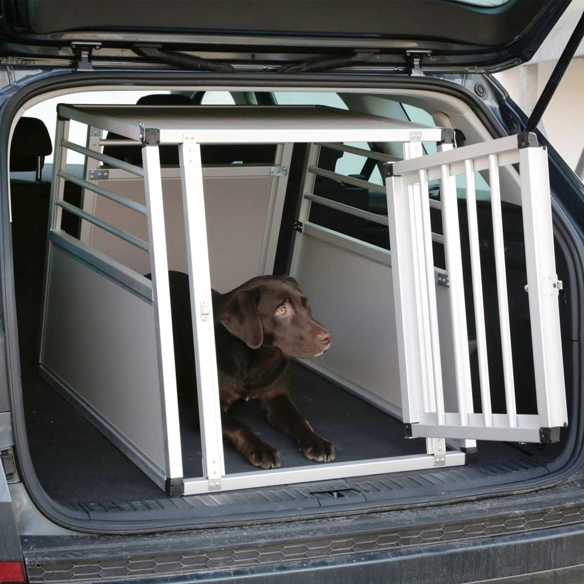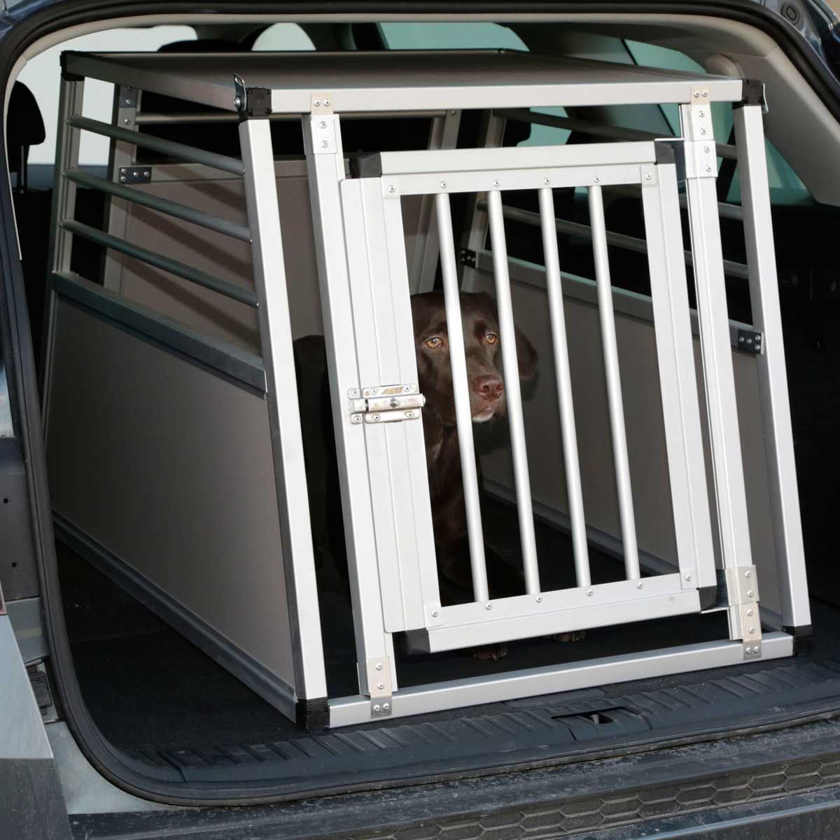 hundtransportlådan var gjord av aluminium och konstruerades som en stabil och säker design. Den lutande fram- och baksidan möjliggör optimal användning av utrymmet i bagageutrymmet. De upphöjda väggarna av hårdpapp garanterar större säkerhet och renhet.