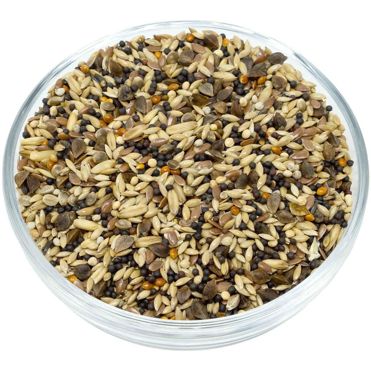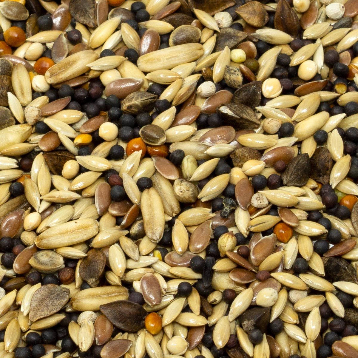 36,00 % glansfrö, 21,00 % svart raps, 14,00 % linfrö, 8,00 % bovete, 6,00 % havregryn, 5,00 % gul hirs, 5,00 % röd hirs, 3,00 % europeisk hampa, 1,00 % negrofrö, 1,00 % vit perillafrö.