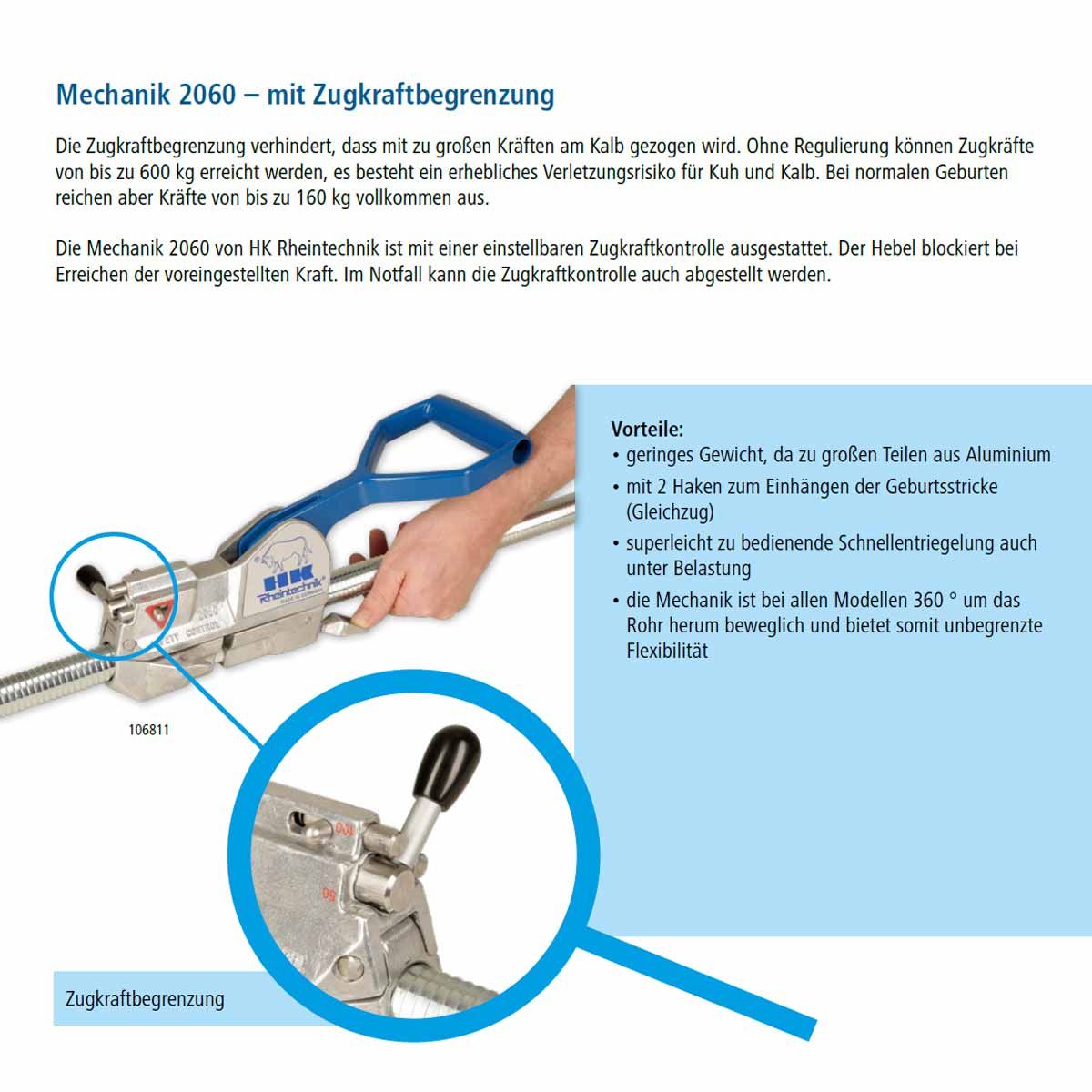 Den speciella egenskapen hos Mechanik 2060 är begränsningen av dragkraften. Detta förhindrar att kalven dras med för mycket kraft. En spak blockerar när den förinställda kraften är uppnådd. I en nödsituation kan den justerbara traktionskontrollen dock också stängas av snabbt och enkelt.