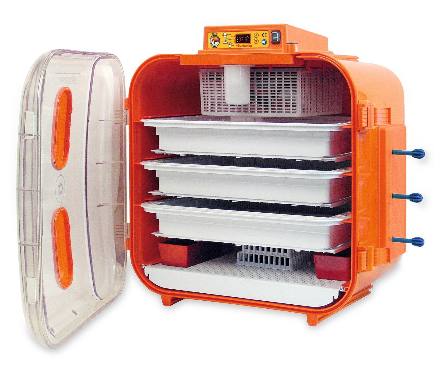 Inkubatorn Covatutto är utrustad med 3 lager och rörliga distanser för olika äggstorlekar. Varje lager kan drivas med en separat motor. Maskinen är mycket hållbar och håller länge. Leveransen omfattar visningsfönster, innerbelysning och digital termometer. Drift med 230 volt.