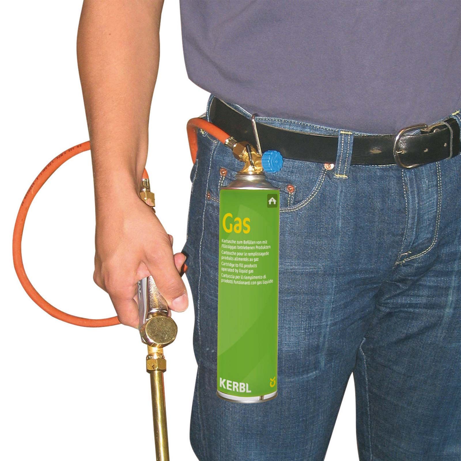Den lämpliga gaspatronen 600 ml måste beställas separat. Innehållet räcker för ca 2-3 drifttimmar (beroende på förbrukning). Tack vare den medföljande bälteshållaren är det enkelt och tidsbesparande att använda gaspatronen