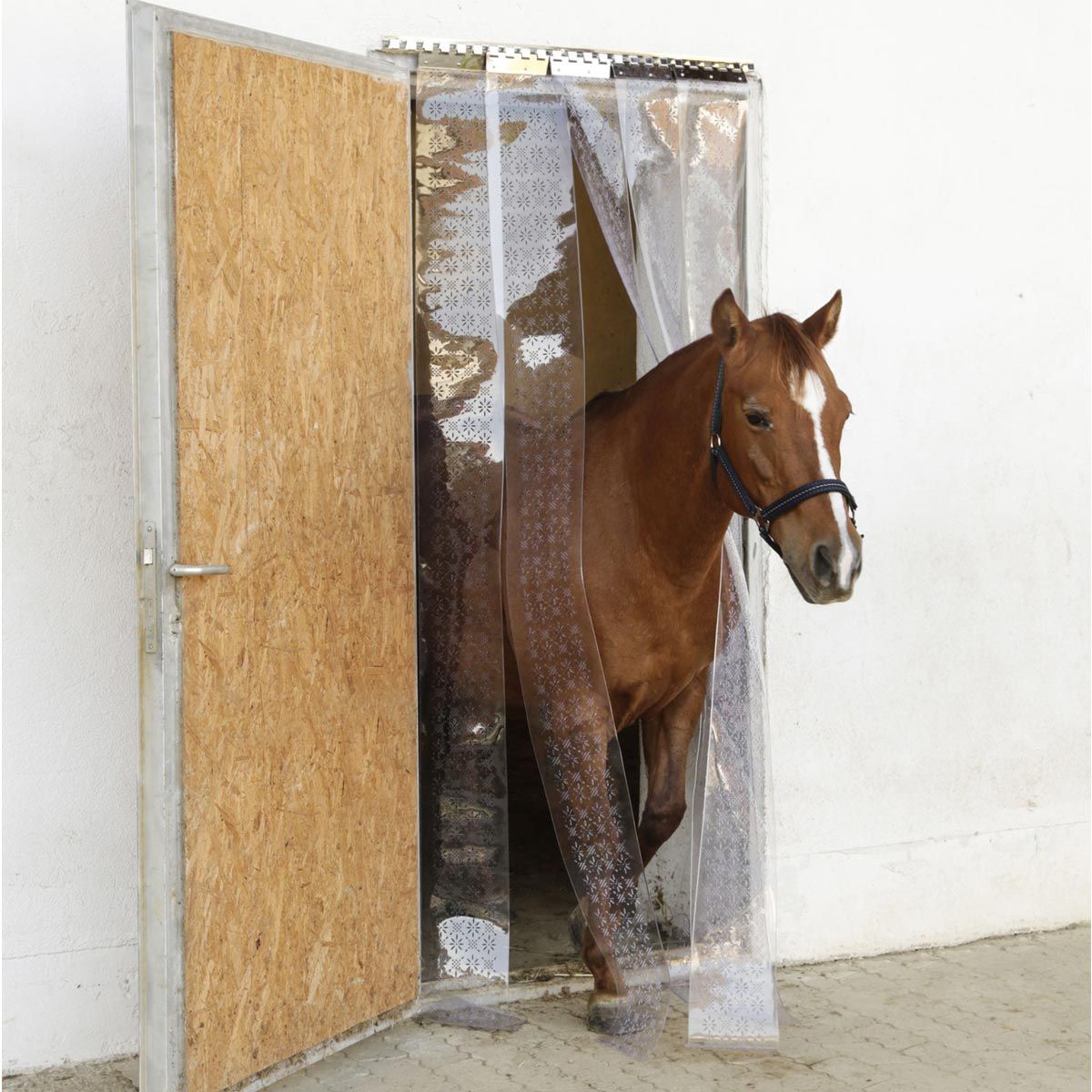 Denna luftiga gardin hjälper till att hålla insekter borta från stallarna. Remsgardinen finns som en komplett uppsättning och som enskilda ersättningsremsor.