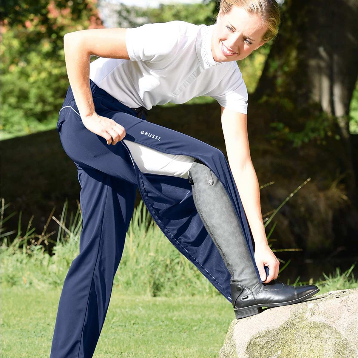 De praktiska överbyxorna för damer skyddar ridbyxorna på ett tillförlitligt sätt mot all smuts och hö. Perfekt för stallarbete eller förberedelser för turneringar. Det lättskötta, andningsbara materialet med stretch-effekt är bekvämt att bära och den bekväma elastiska linningen kan dessutom fixeras med dragsko. Tvåvägsdragkedjor på sidorna gör det lätt att ta på och av den, även med ridstövlar. Rymliga fickor med dragkedja fram och bak ger tillräckligt med plats för mobiltelefon, nycklar, godis eller manerringar.