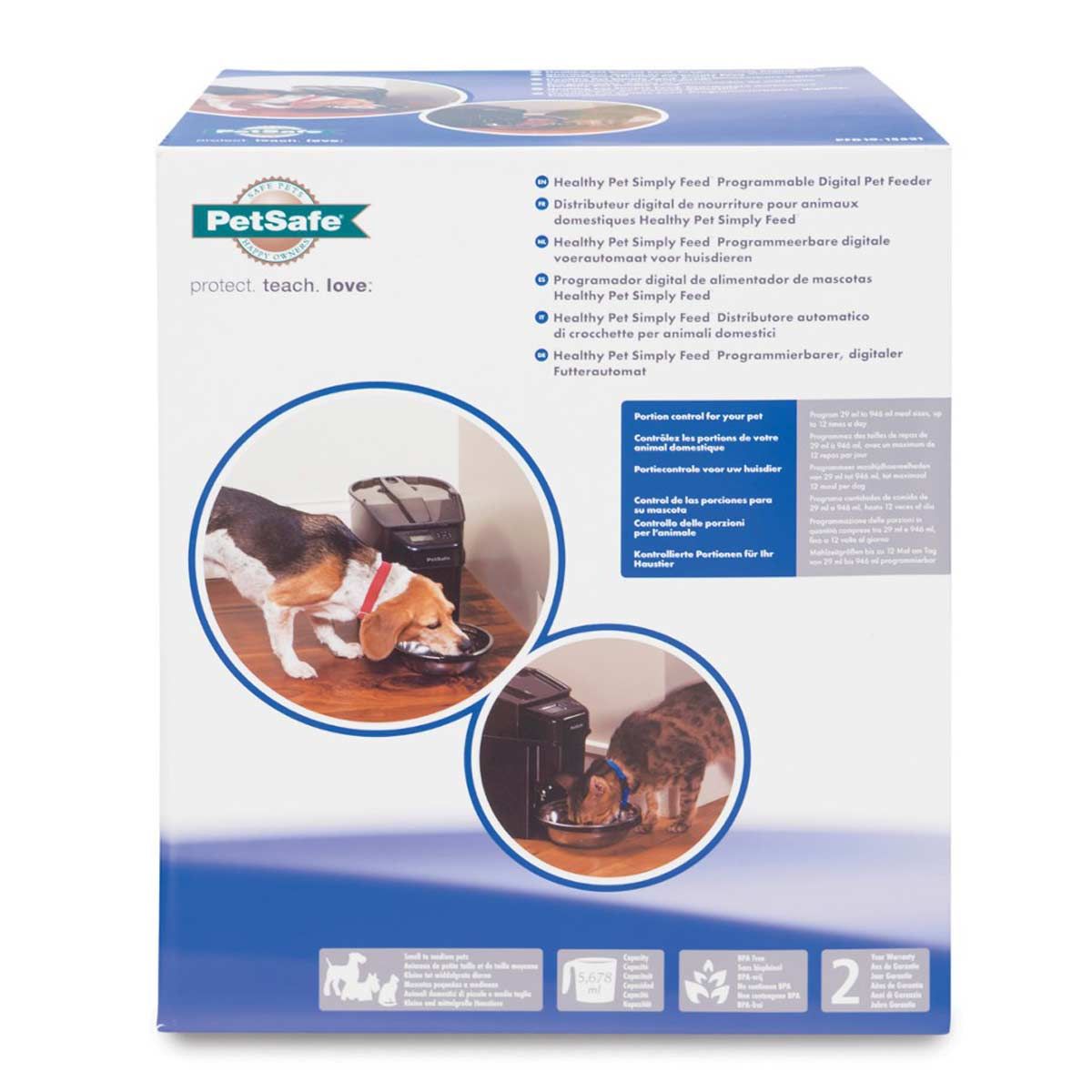 Med den eleganta och moderna automatiska mataren för hundar och katter kan du vara säker på att ditt husdjur alltid matas kl. rätt tid kommer – oavsett om du är hemma eller inte. Ställ in snabbt via matningsscheman för hundar eller katter, med förinställda måltidsportioner två gånger om dagen. Användaralternativet låter dig anpassa ditt matningsschema för upp till 12 måltider om dagen, så att du kan hantera ditt husdjurs utfodring optimalt. Med den klara foderbehållaren på 5 678 ml (24 koppar) krävs färre påfyllningar och fodernivåerna kan enkelt kontrolleras. Healthy Pet Simply Feed™ hjälper dig att hantera ditt husdjurs vikt genom att tillhandahålla konsekvent, portionskontrollerad utfodring så att ditt husdjur är friskare och gladare.