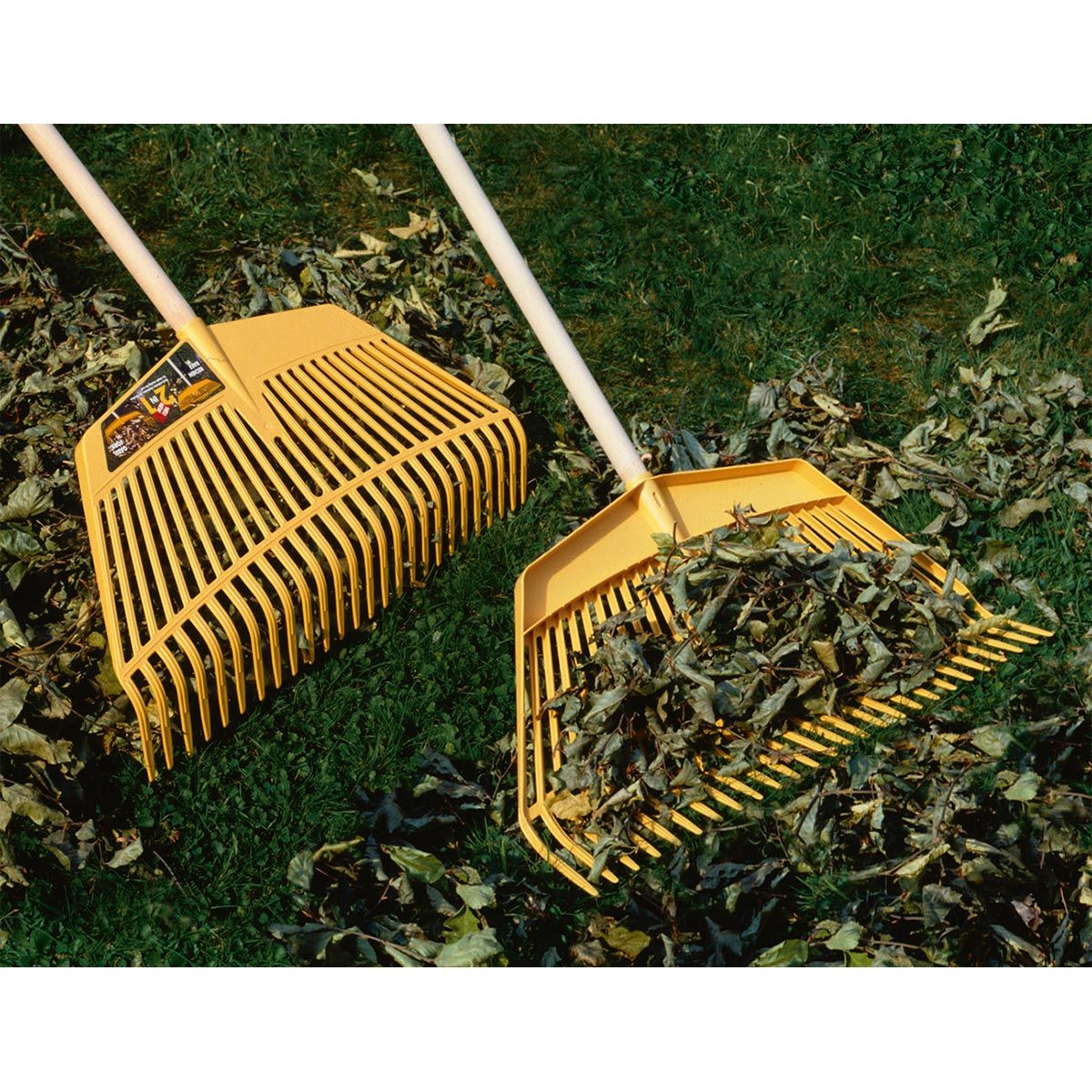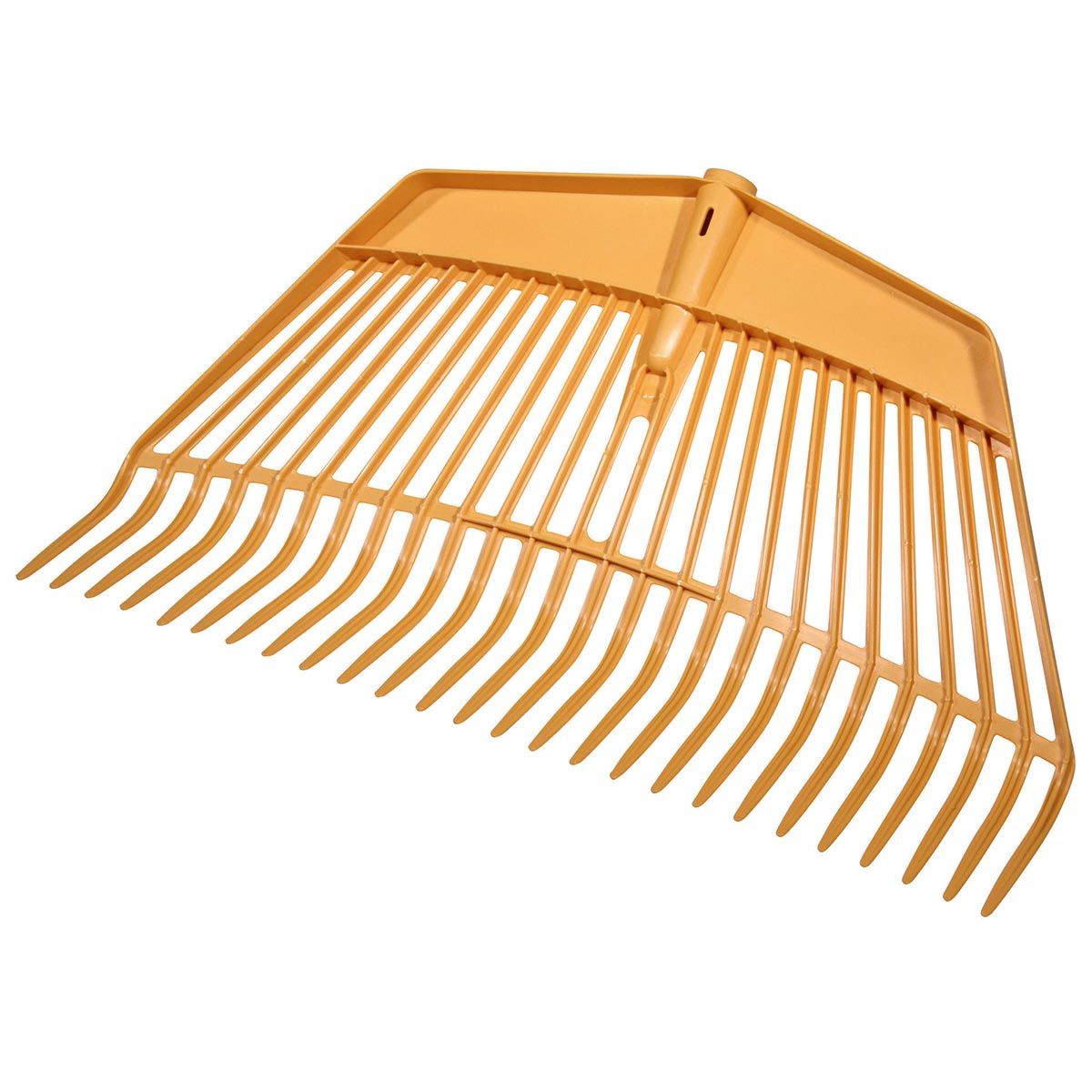 Kombianordningen med lövkratta och gaffel kan användas som lövkratta och även som gaffel genom att vrida den 180°. Detta gör det möjligt att transportera det insamlade materialet till en behållare utan att böja sig ner.