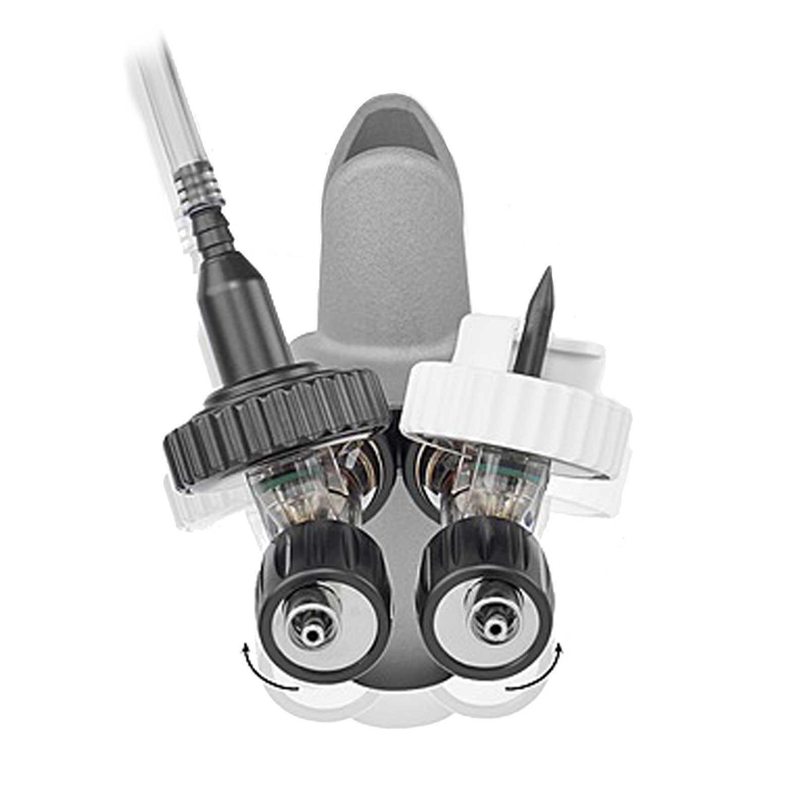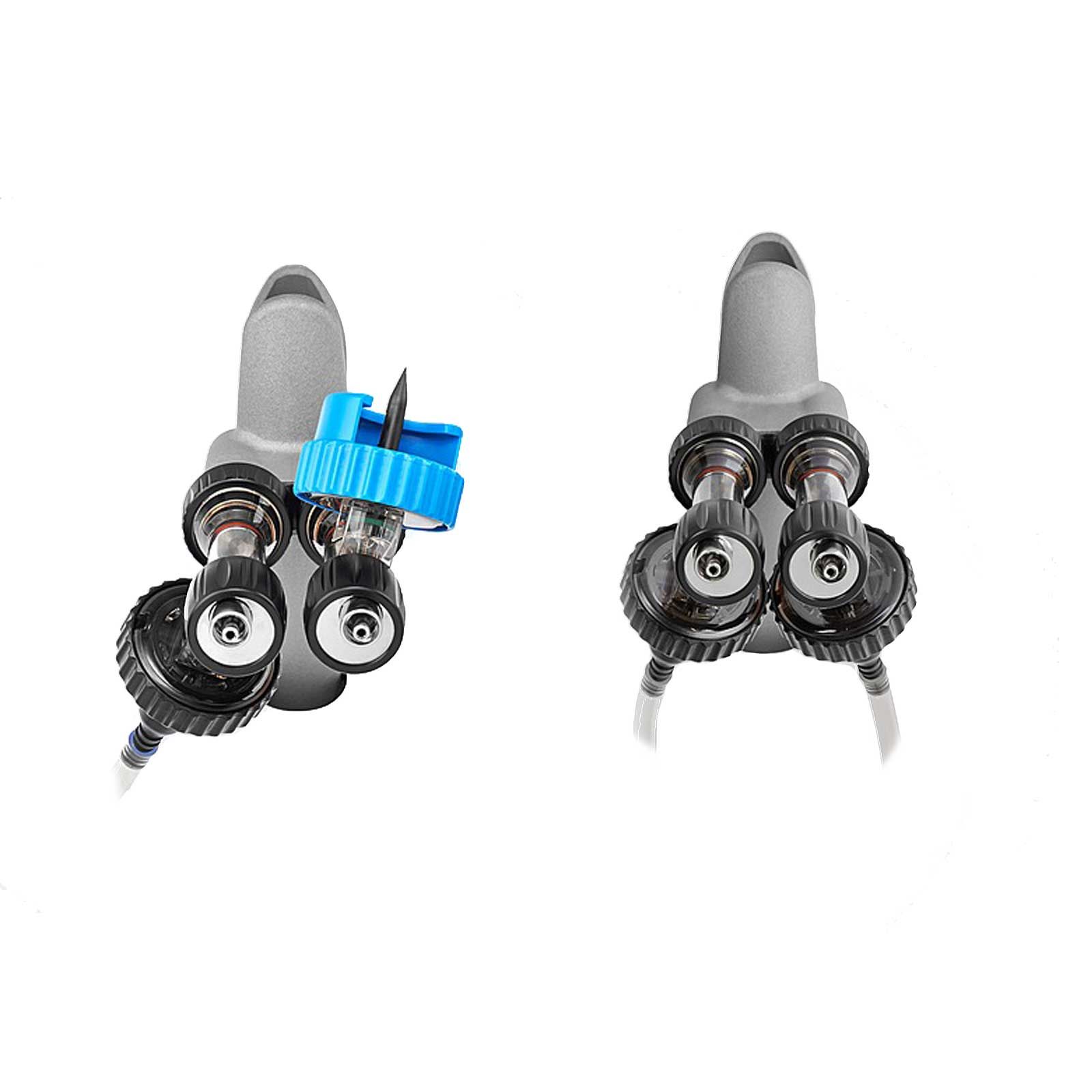 Den förstklassiga plastsprutan TWIN med två separata cylindrar gör det möjligt att administrera två läkemedel/vacciner samtidigt utan att blanda dem.Den extra slangadaptern kan användas i stället för flaskadaptern som levereras med injektorn.