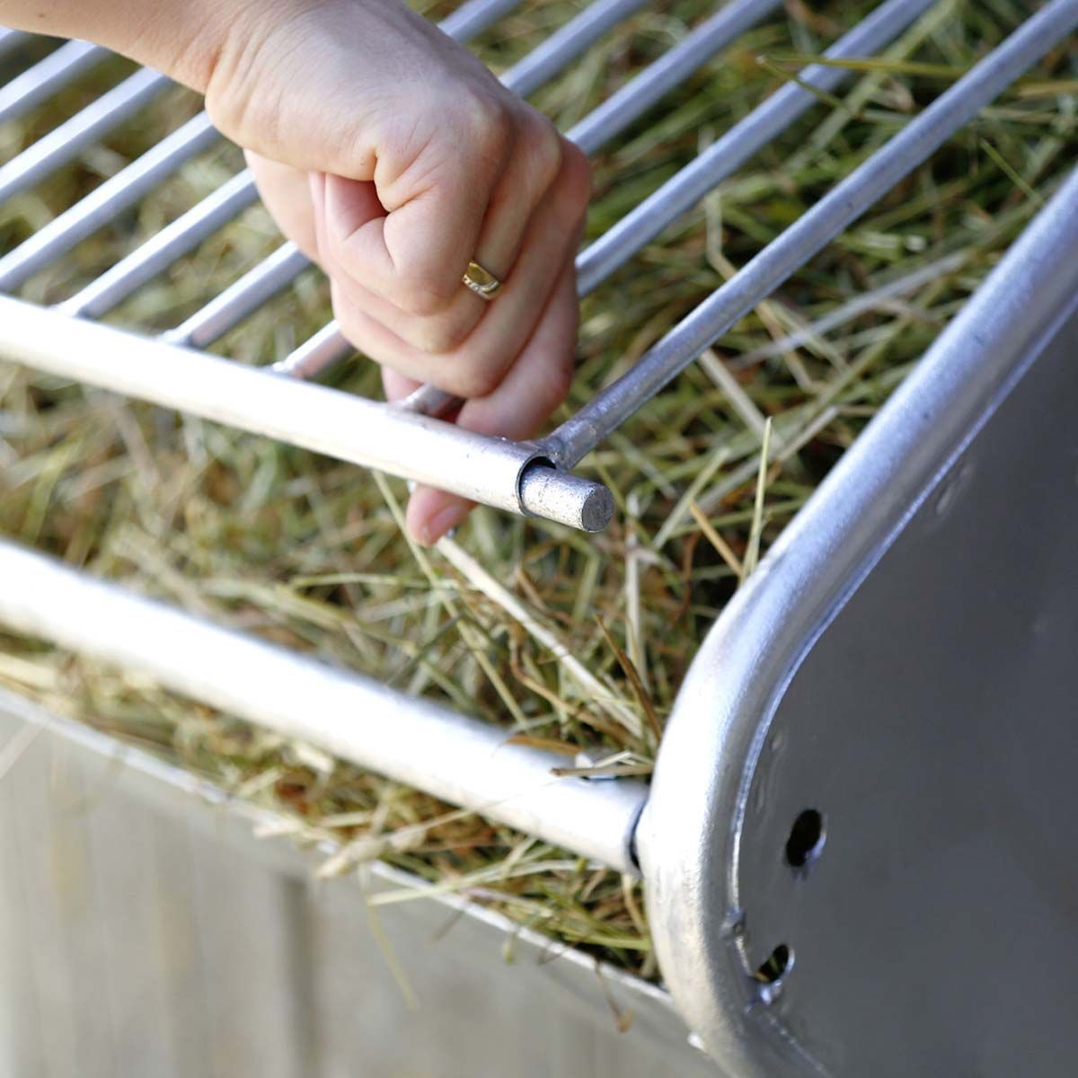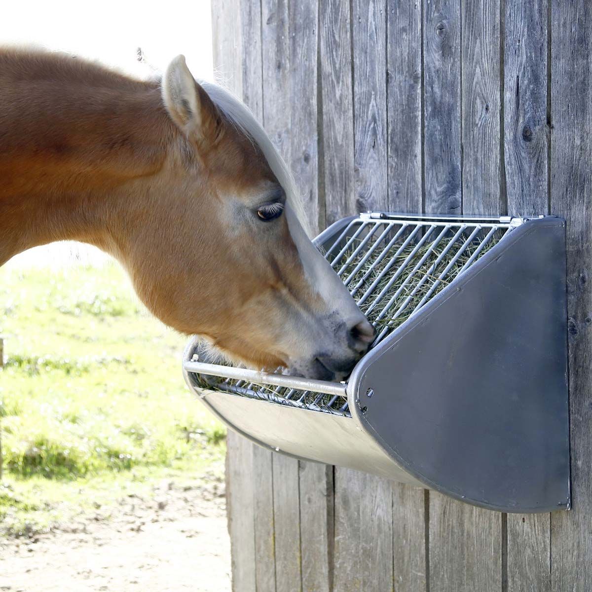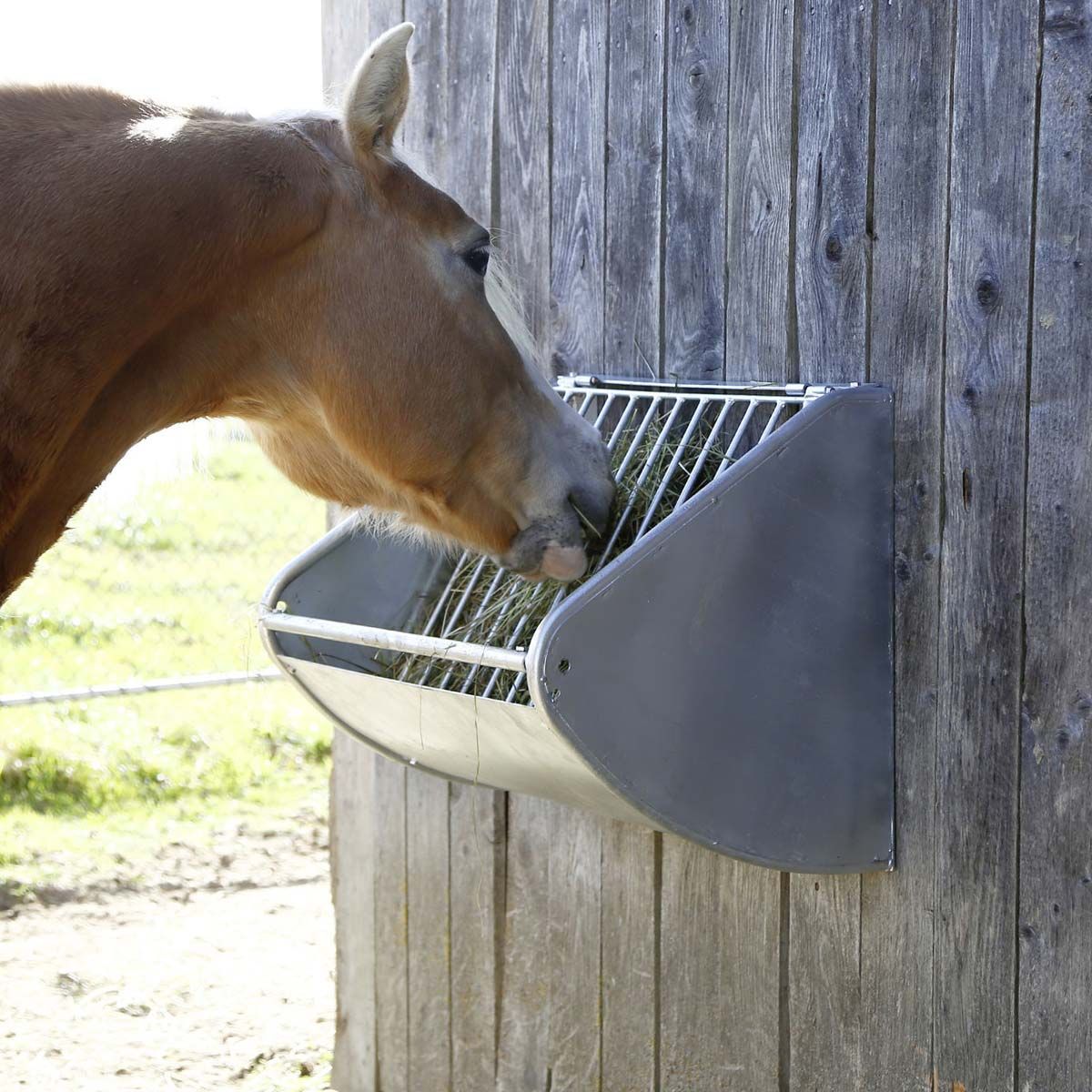 Detta höställ för hästar är ett högkvalitativt och robust foderställ för stallet. Hösthållaren är tillverkad av galvaniserad metall, extremt hållbar och lämplig för väggmontering. Hösthållarens speciella utformning gör det möjligt för hästen att äta på ett artanpassat och långsamt sätt. Hästhagens galler pressas mot fodret av den roterande gångjärnen under utfodringen. Hästen får små portioner och hålls sysselsatt med att äta under lång tid.