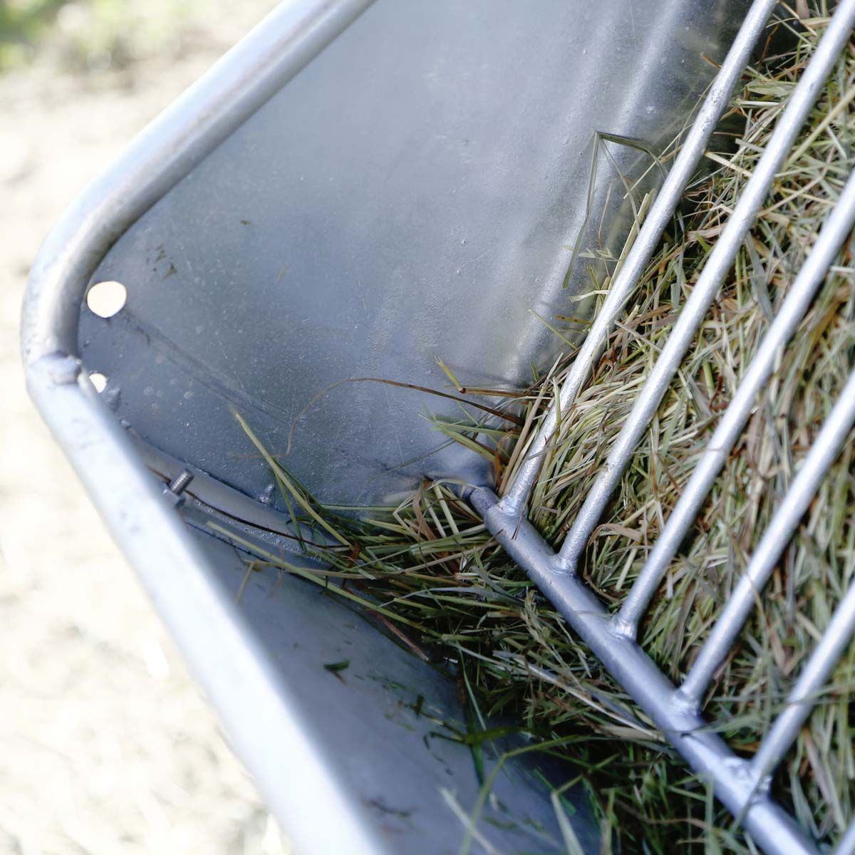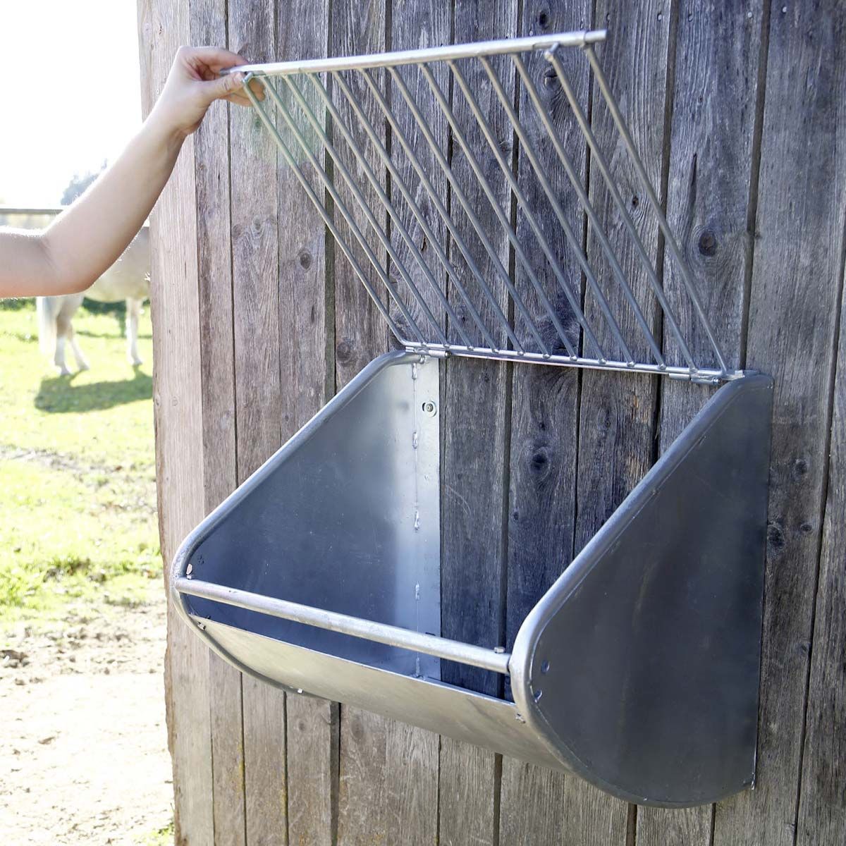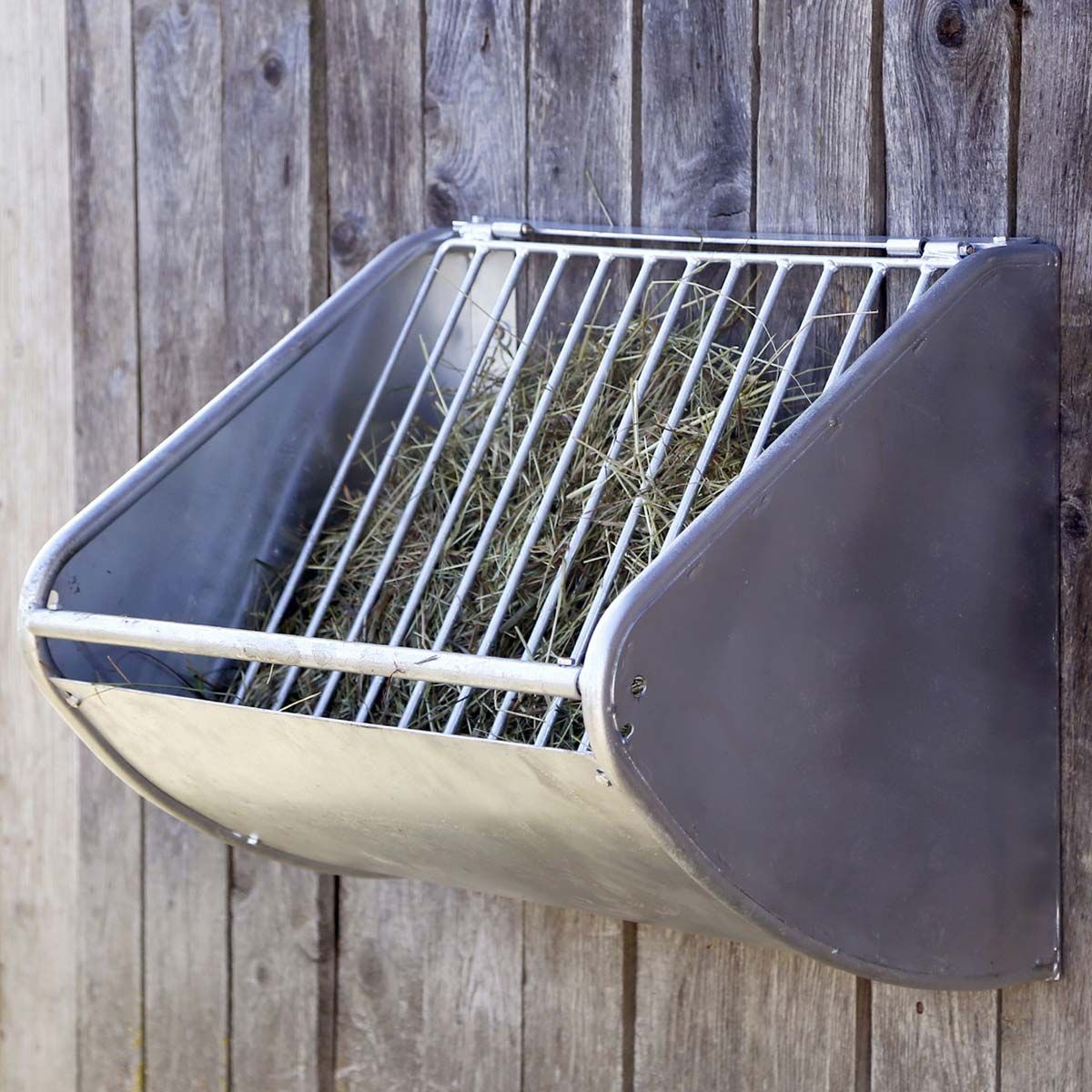 Detta höställ för hästar är ett högkvalitativt och robust foderställ för stallet. Hösthållaren är tillverkad av galvaniserad metall, extremt hållbar och lämplig för väggmontering. Hösthållarens speciella utformning gör det möjligt för hästen att äta på ett artanpassat och långsamt sätt. Hästhagens galler pressas mot fodret av den roterande gångjärnen under utfodringen. Hästen får små portioner och hålls sysselsatt med att äta under lång tid.
