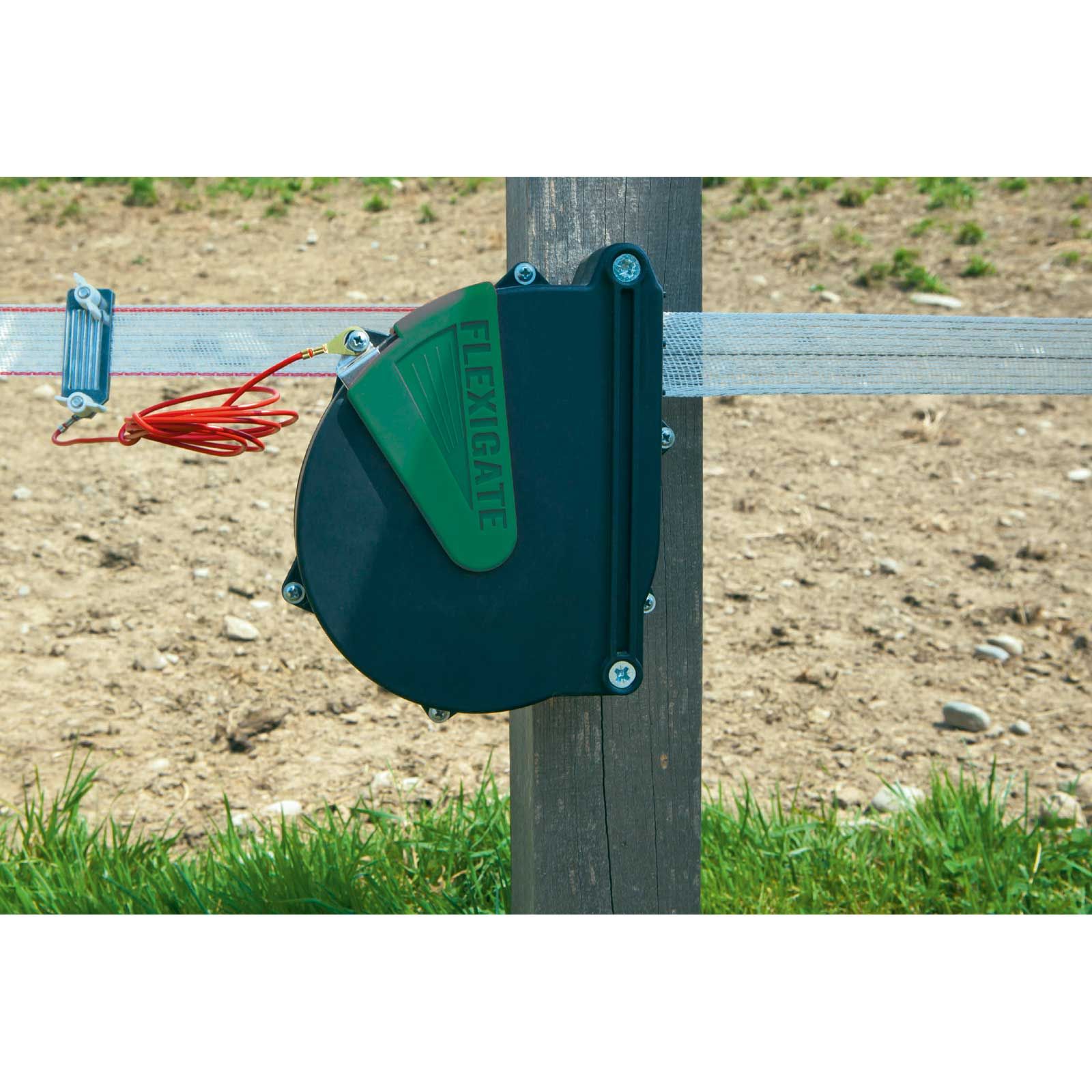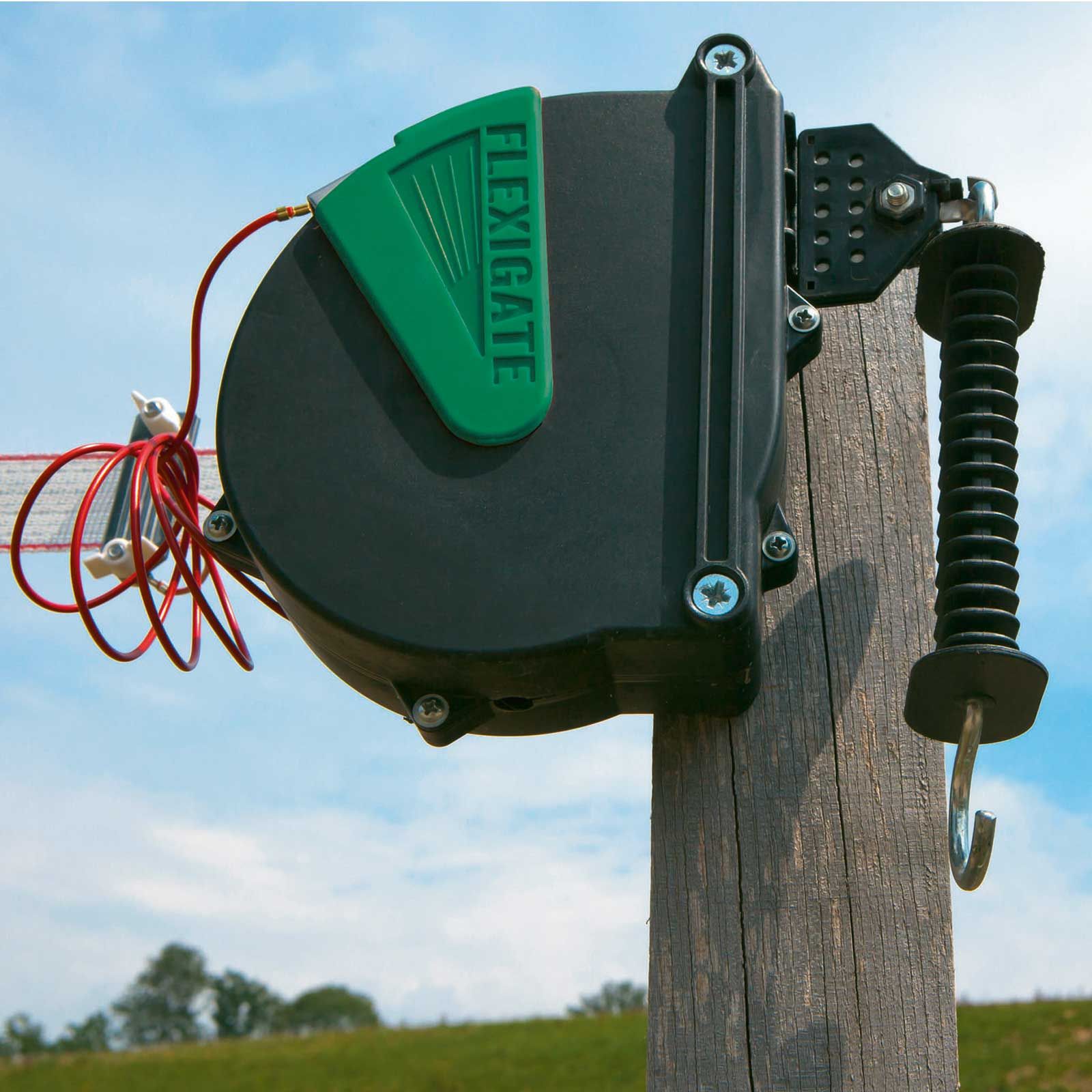 Med flexigate gate gate system kan du enkelt och bekvämt elektrifiera kopplingsingångarna till ditt betesstängsel. Varje gång grinden öppnas rullas elkabeln in av en stålfjäder.