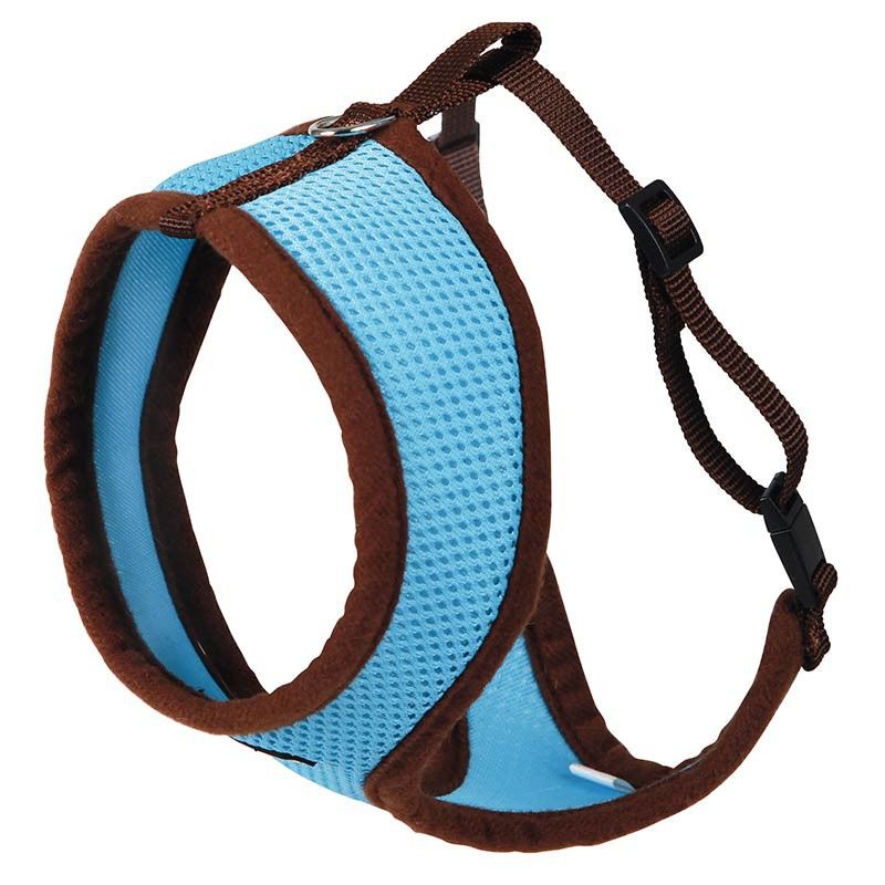 Du får en mjuk, mjuk sele gjord av mesh. Bröstomkretsen är steglöst justerbar, med en stadig klickstängning. Säker, stabil och ändå väldigt lätt.