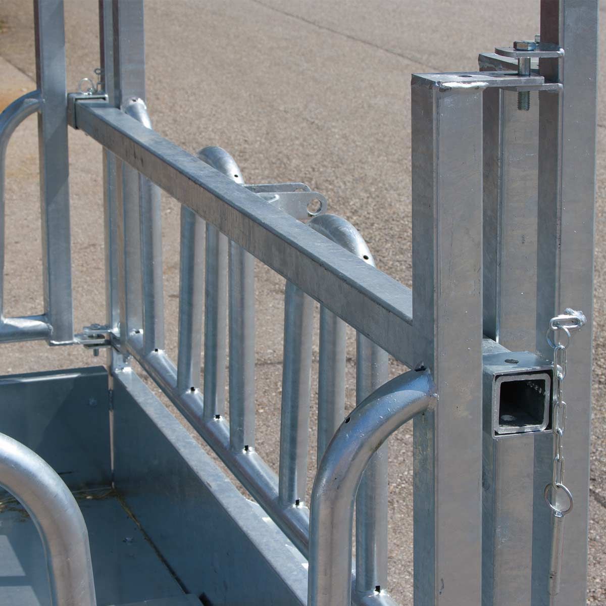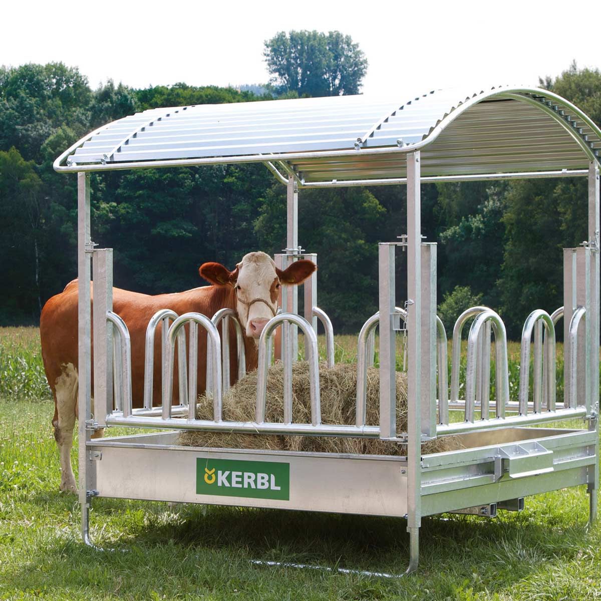 Det fyrkantiga höstället med palisadfodergaller är lämpligt för säker utfodring av hästar och boskap. Tack vare de höjdjusterbara löparna kan hyllan anpassas optimalt till djurens storlek. Den har 12 matningsplatser och 2 sidor kan enkelt öppnas för fyllning. Racket är lämpligt för rundbalar och rektangulära balar med en längd eller diameter på upp till 1,8 m. Den stabila konstruktionen stöds dessutom av två fyrkantiga rörbalkar och har därmed en hög bärförmåga. Hösthållaren är varmförzinkad. Skyddet mot takkanten och trepunktsskyddet gör att djuren inte kan skada sig själva. Tack vare trepunktsfästet kan foderräven flyttas optimalt med traktorn.