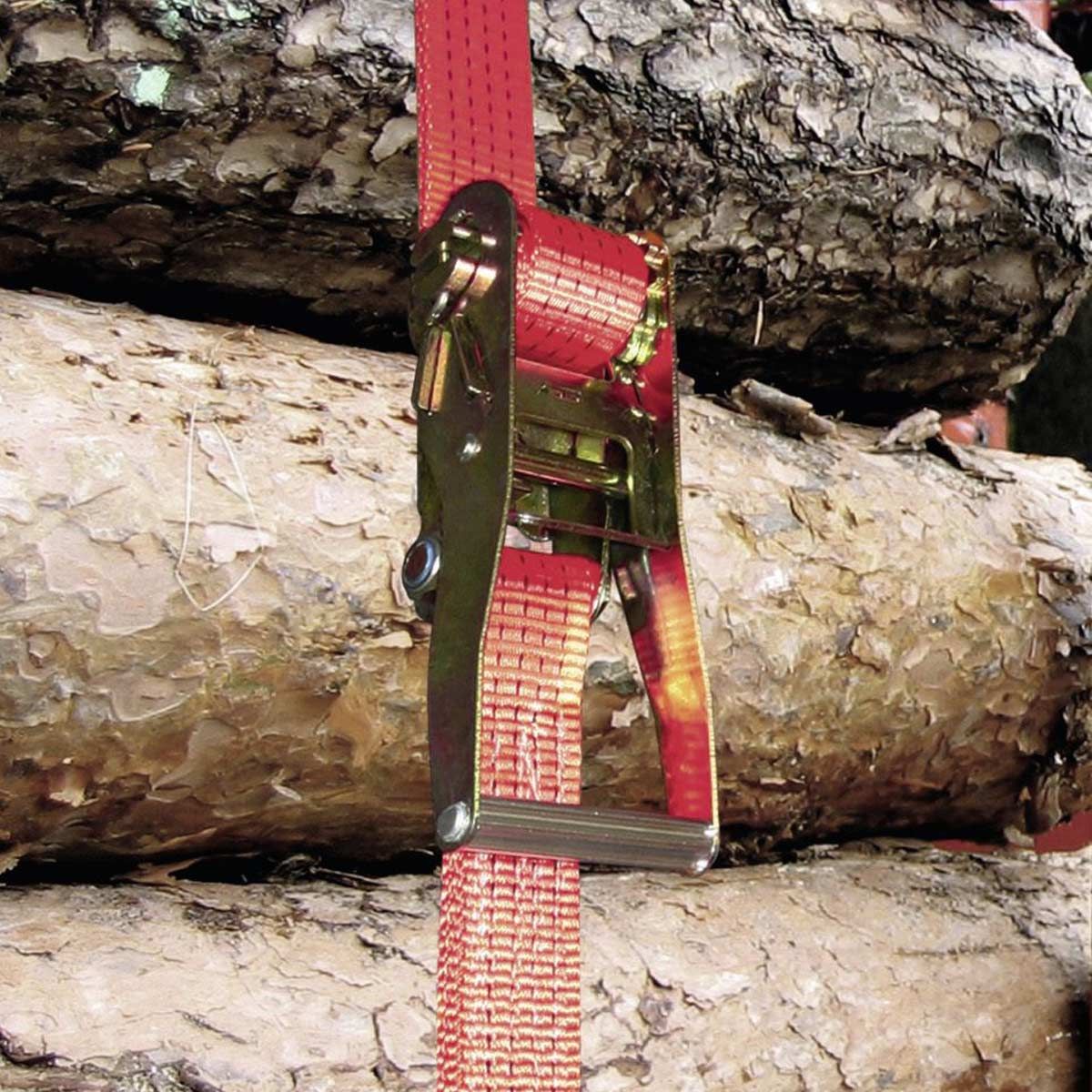 Det tvådelade spännbandet med ratchet och triangelkrok och triangelring garanterar en säker hantering.