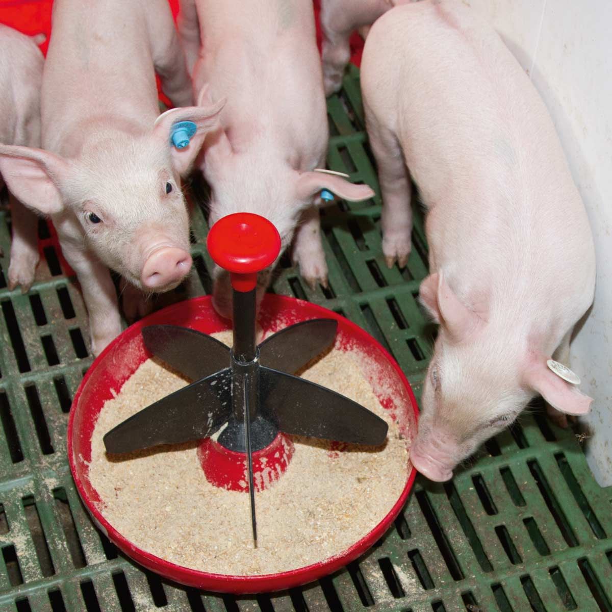 - Vingarna, som delar in brickan i fem foderplatser, förhindrar grisarna från att kasta ut maten ur brickan och från att klättra in i brickan och förorena maten.