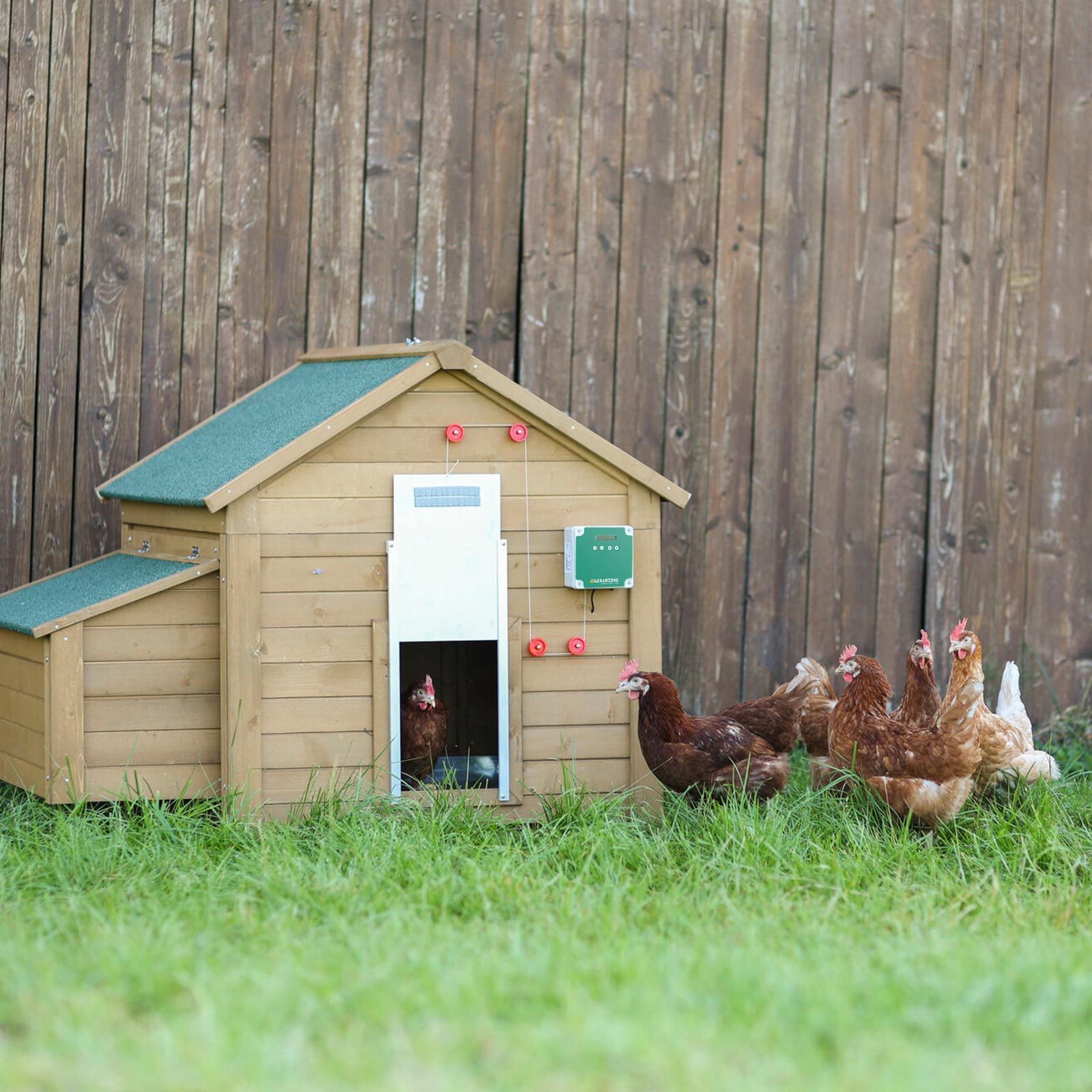Med den automatiska kycklingdörren kan kycklingluckor, dörrar eller skjutreglage på fjäderfähusen öppnas och stängas automatiskt beroende på tid på dygnet eller ljusstyrka.