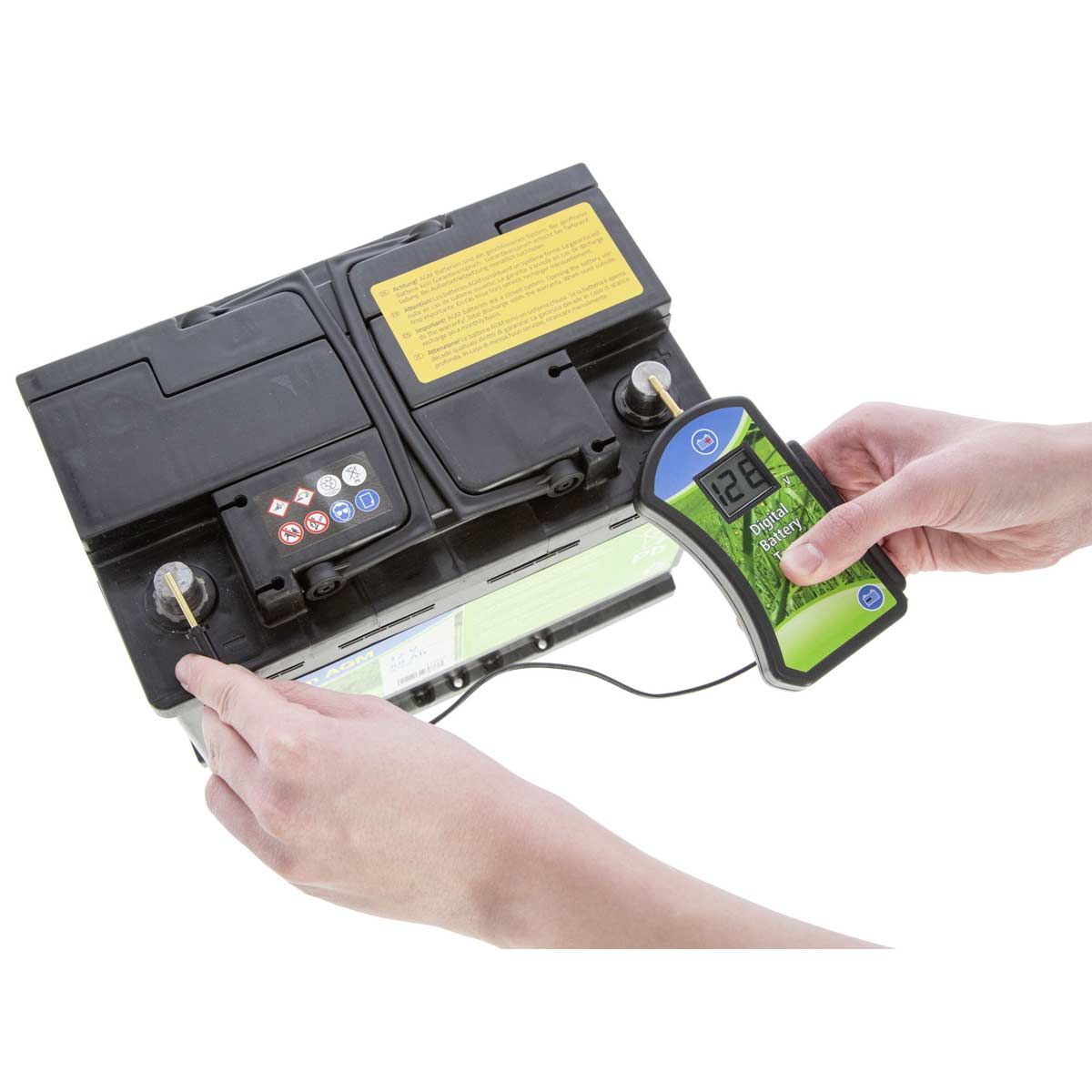 Med Digital-Battery-Tester kan du testa dina betestillbehör i ett testområde från 6 till 20 volt, så att du alltid har full kapacitet och optimal laddning. På så sätt kan du förhindra fel eller inte helt laddade batterier och öka deras livslängd, eftersom den minskar om de inte laddas på rätt sätt. Spänningen i öppen krets (i början) och spänningen under belastning (efter "-"-tecknet) visas.