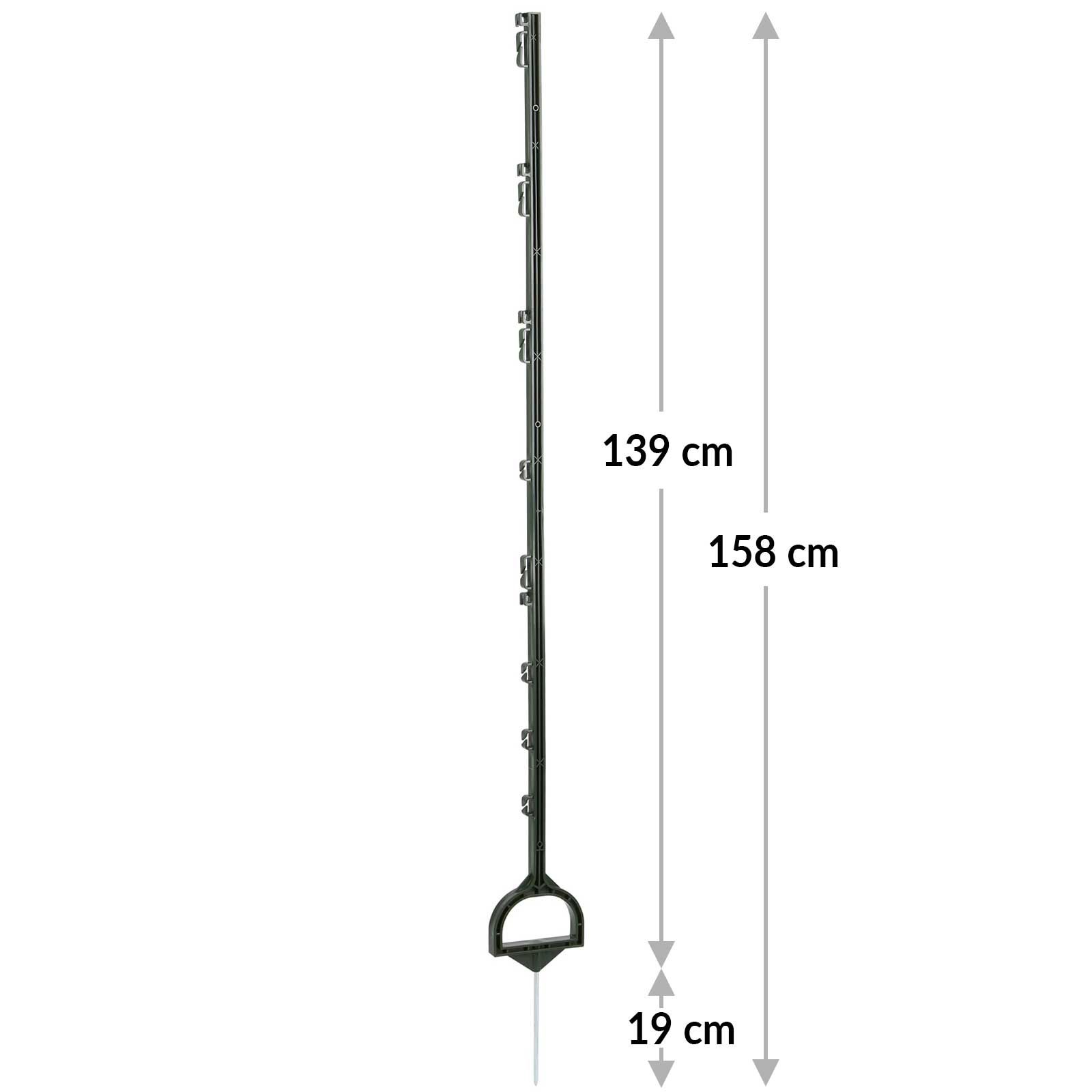 Plaststolpe med glasfiberförstärkning är det perfekta valet för alla som letar efter en robust och flexibel plastpinne för betesstängsel. De mobila plastpålarna är idealiska för att hålla vilt ute samt för att stänga in nötkreatur, hästar & co. Med en total längd på 158 cm och en längd över marken på 139 cm erbjuder de en idealisk höjd för effektiv stängselinstallation.