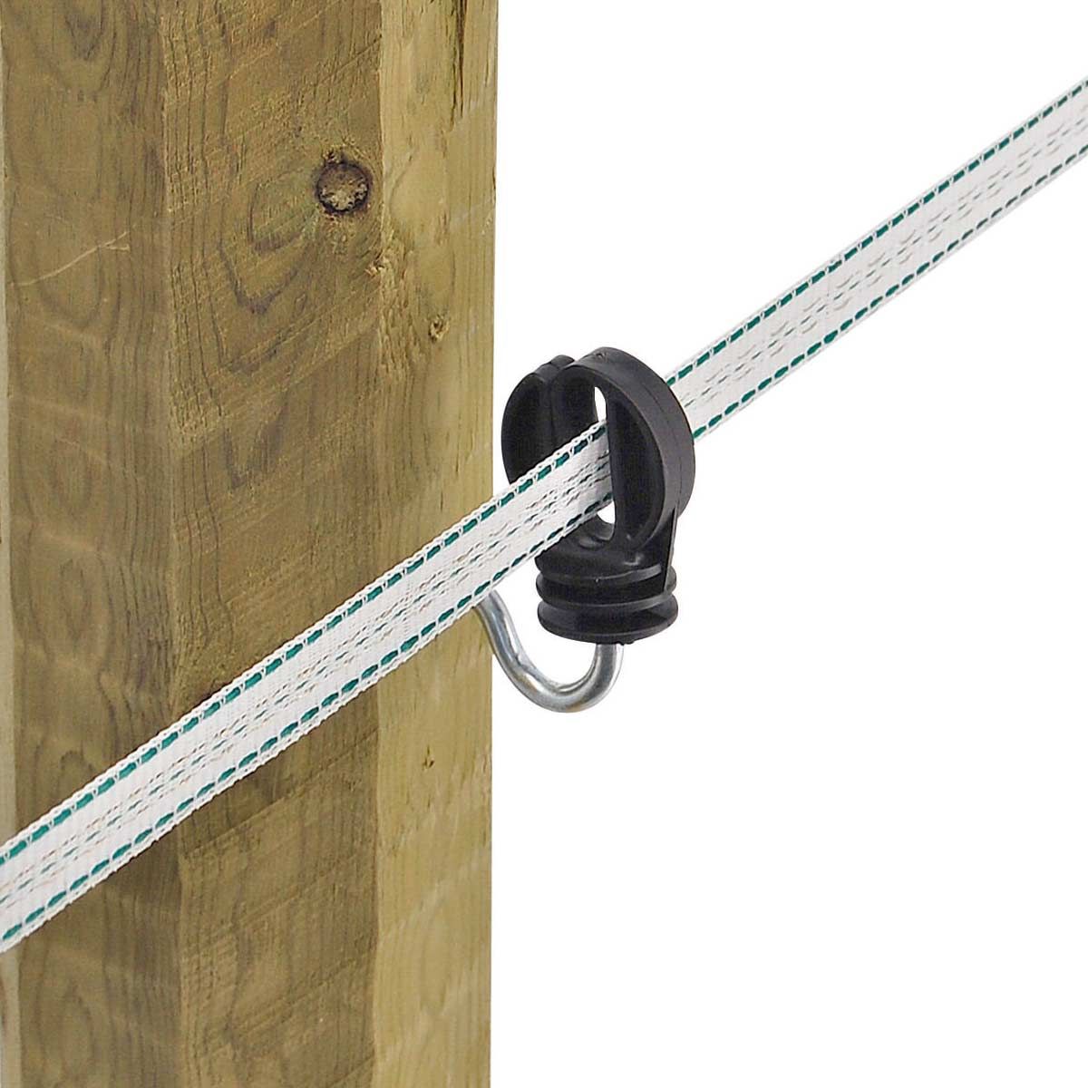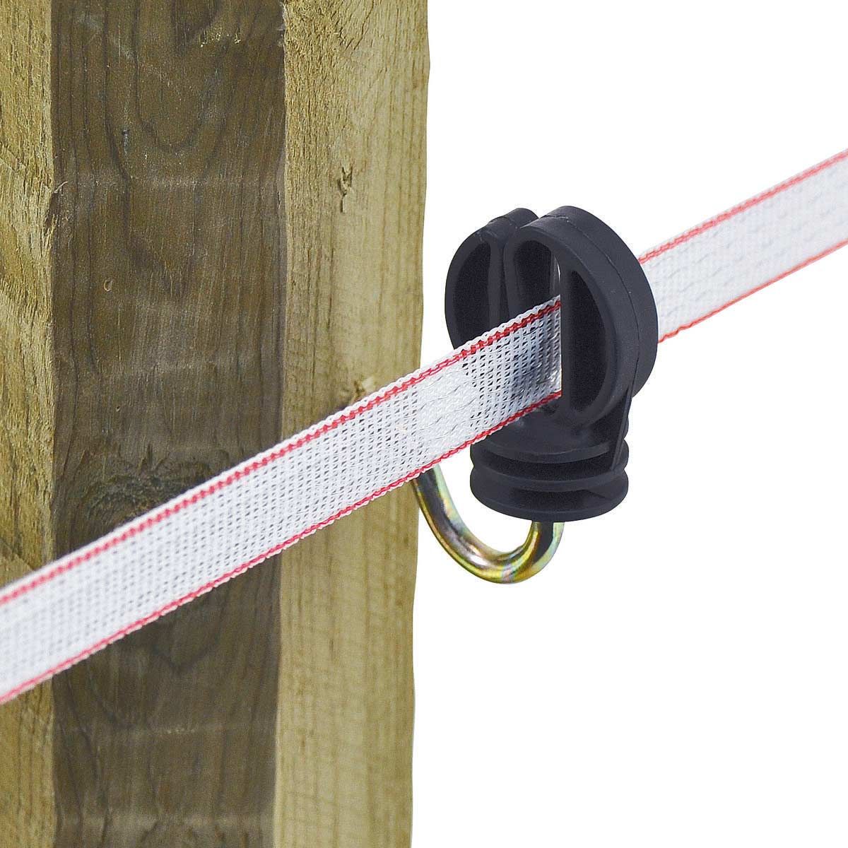 . Den här breda bandisolatorn är lämplig för pilband upp till 20 mm tack vare det extra långa stödet och den robusta trätråden. Betesbandet är fritt rörligt i isolatorn. Den kan därför dras igenom och spännas igen utan problem. Ledarmaterialet är säkert styrt i isolatorn, t.ex. kan det inte hoppa ut ens vid stark vindbelastning. Tre droppnosar på isolatorhuvudet säkerställer en särskilt god isolering.En överblick