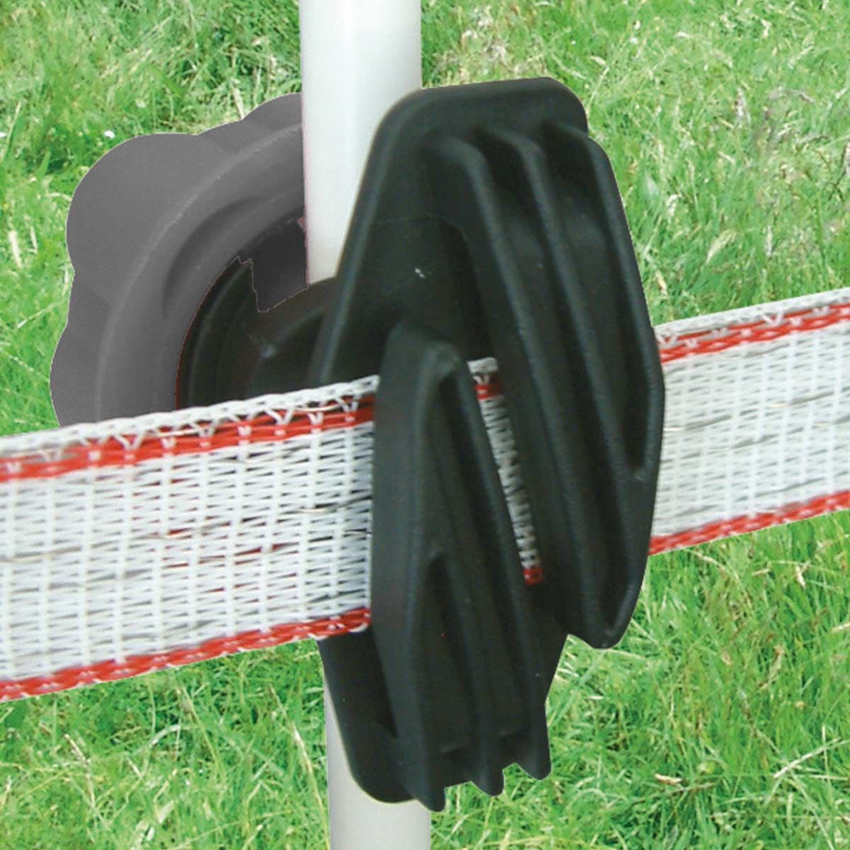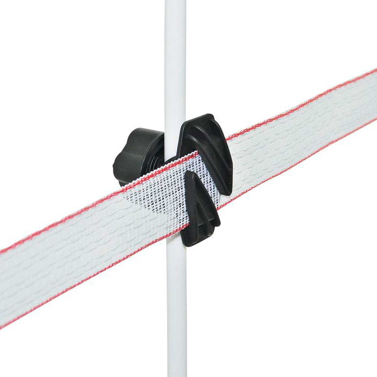 Bandisolatorn är lämplig för alla vanliga metall eller plaststolpar med en diameter på upp till 17 mm. Skruvisolatorn fästs på sidan av stolpen och skruvas fast. Den patenterade skruvisolatorn är tillverkad av slagtålig plast och är extremt robust.
