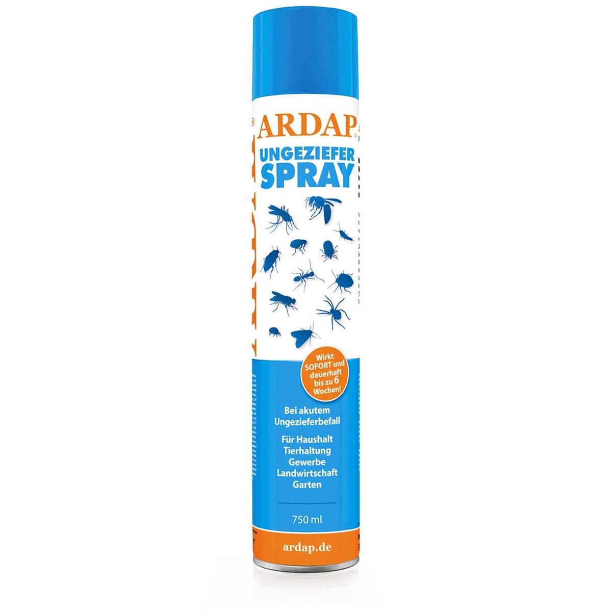 ARDAP Vermin Spray är en effektiv universell skadedjursspray för bekämpning av alla typer av insekter och skadedjur. Sprayen utvecklar sin effekt direkt efter den första appliceringen och håller i upp till 6 veckor utan att lämna en obehaglig lukt! Det hjälper särskilt vid akut skadedjursangrepp i djurens omedelbara närhet, på gårdar och i hushållen. Produkten kan sprayas på trä, klädsel eller helt enkelt i rummet och sprids optimalt i hörn och nischer.