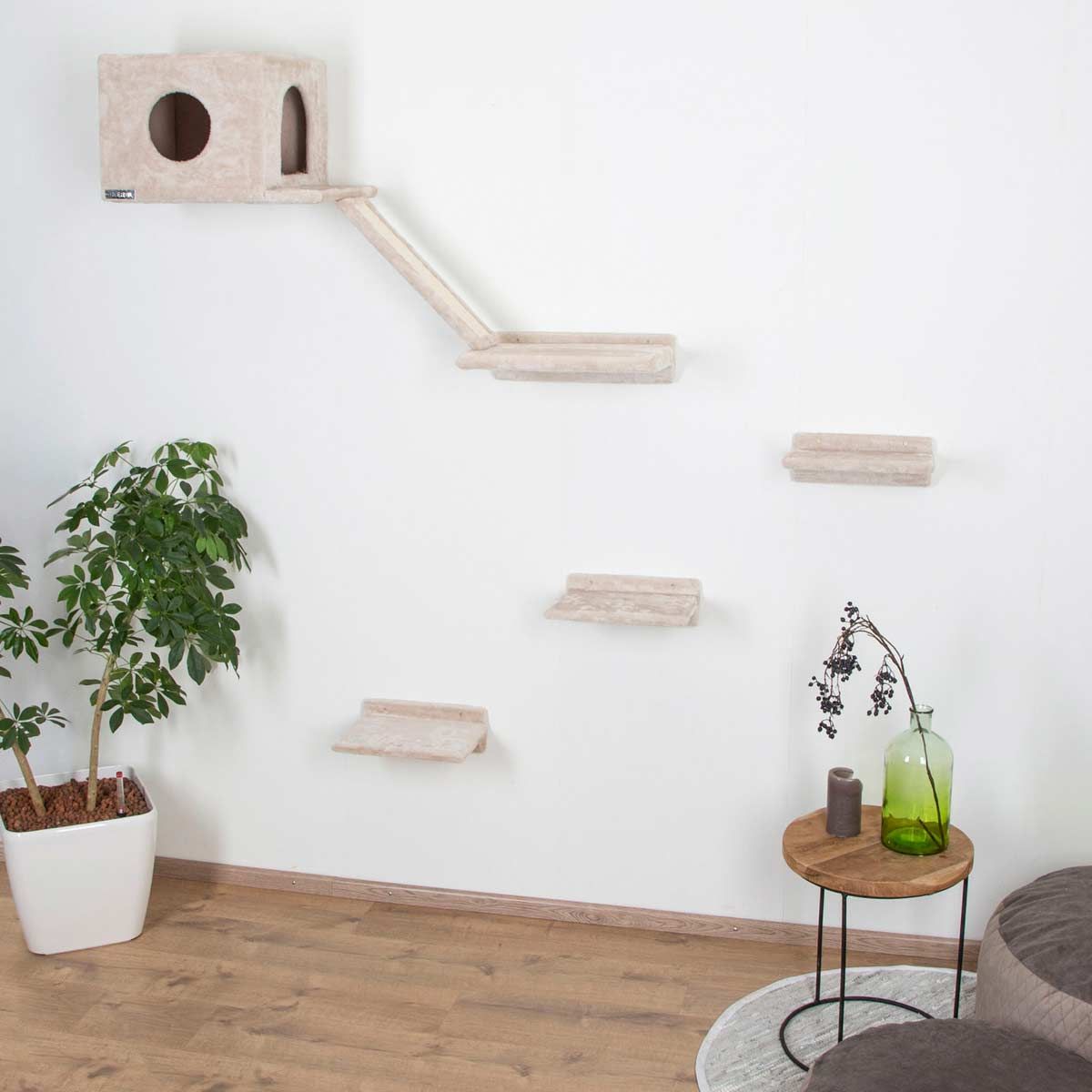 Klätterväggssystemet i flera delar ger katter tillräckligt med fri- och lekutrymme - även i mindre lägenheter. Från startpaketet med 5 delar till den kompletta vägglösningen med 9 delar uppfylls alla kattönskningar och de fyrbenta vännerna erbjuds ett klätterparadis inom sina egna 4 väggar. Alla uppsättningar levereras med det nödvändiga väggmonteringsmaterialet och monteringsanvisningar.