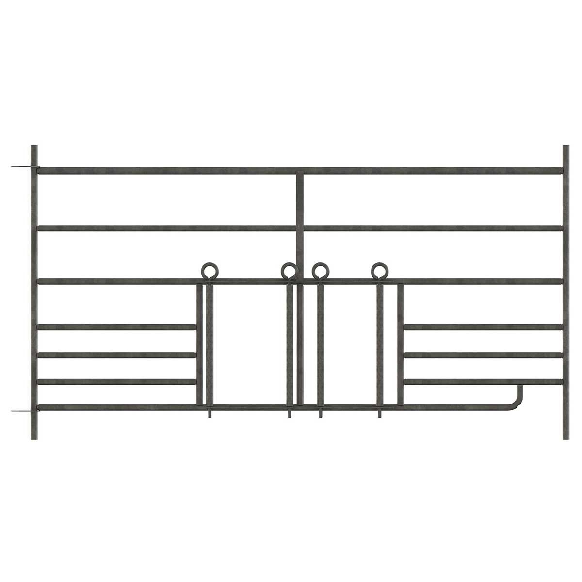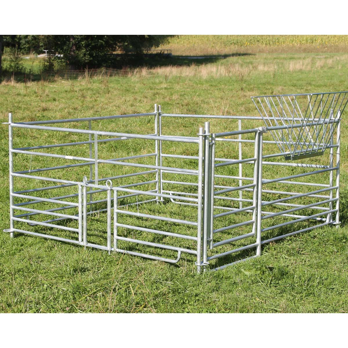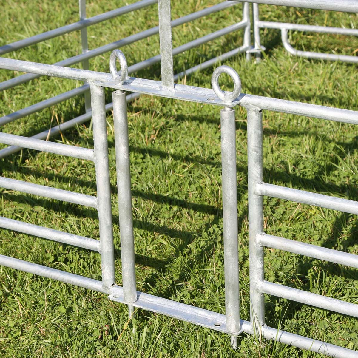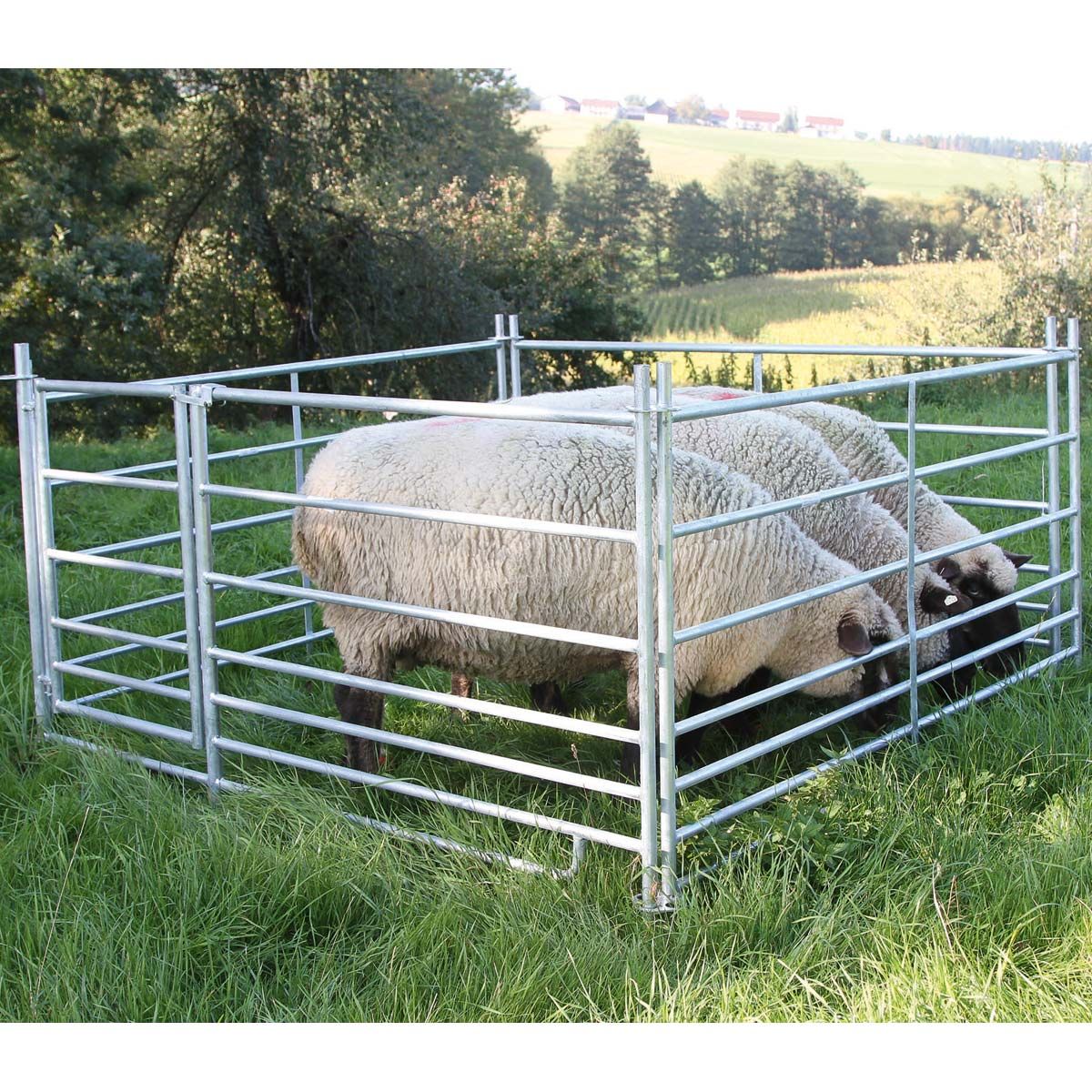 Fårpanelen med grind är idealisk för säker åtkomst till dina djur. Grinden har en passage bredd på 57 cm och är det bästa sättet att säkra tillträdet till besättningen. Den plug-in hjorduppsättningen inspirerar med sin enkla montering och demontering och är idealisk för att driva får och getter. De två lammskinnarna är centralt placerade och har en justerbar bredd på 18-25 cm. Vid behov kan de unga djuren dra sig tillbaka till sitt eget område, där t.ex. specialfoder kan ges utan problem. Församlingsområden, boxar, individuella och gruppboxar eller boxavdelningar kan inrättas mycket snabbt och flexibel med de 4 fårpanelerna. Om du vill expandera kan du justera panelerna efter behov och lägga till fler för att få ännu mer utrymme. Ett obegränsat antal paneler kan kombineras med varandra. 7 tvärgående rör med ökande avstånd från botten till topp förhindrar att lammen glider igenom. Den här fårpanelen är tillverkad av varmförzinkat stålrör och lovar hög stabilitet, väderbeständighet och hållbarhet.
