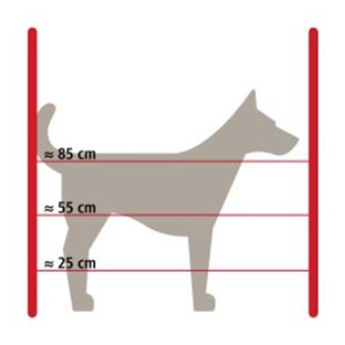 Observera: Justera staketets höjd efter din hunds storlek. För små hundraser (axelhöjd upp till 39 cm) rekommenderas minst tre rader stängsel i staketets nedre del. För hundar som gillar att hoppa och större raser med en axelhöjd på 60 cm eller mer rekommenderas cirka sex rader stängsel . Vid behov kan du enkelt förlänga hundstängslet med ytterligare stängselsträngar. För att säkerställa en optimal strömförsörjning vid staketet bör skyddsstaketet inte ha någon tung vegetation. På samma sätt rekommenderar vi att du använder ett externt blixtskydd.