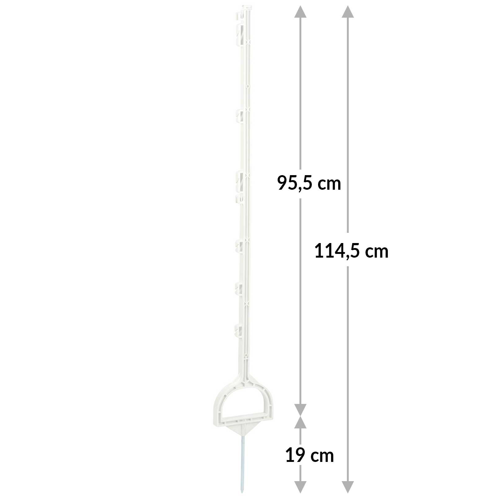 Våra mobila stängselstolpar med glasfiberförstärkning är idealiska för alla som behöver en mobil stängselstolpe i plast. Med en total längd på 114,5 cm och en längd ovanför marken på 95,5 cm erbjuder plast-stolpen en optimal höjd för stängsel av får, hundar och andra små djur samt för viltförsvar.