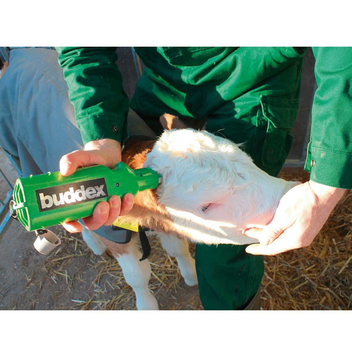 Buddex batteridrivna avhorningsapparat är optimalt lämpad för artanpassad avhorning. Den unika brännringen förhindrar horntillväxt på ett tillförlitligt sätt och på ett djurvänligt sätt. Den höga temperaturen på 700 °C i brännringen gör att kalven kan avhorna på några sekunder. Uppvärmningsfasen startar först när ett tryck läggs på hornets bas. Det finns inget skaft som värms upp helt och hållet och därför finns det ingen risk för brännskador för användaren.