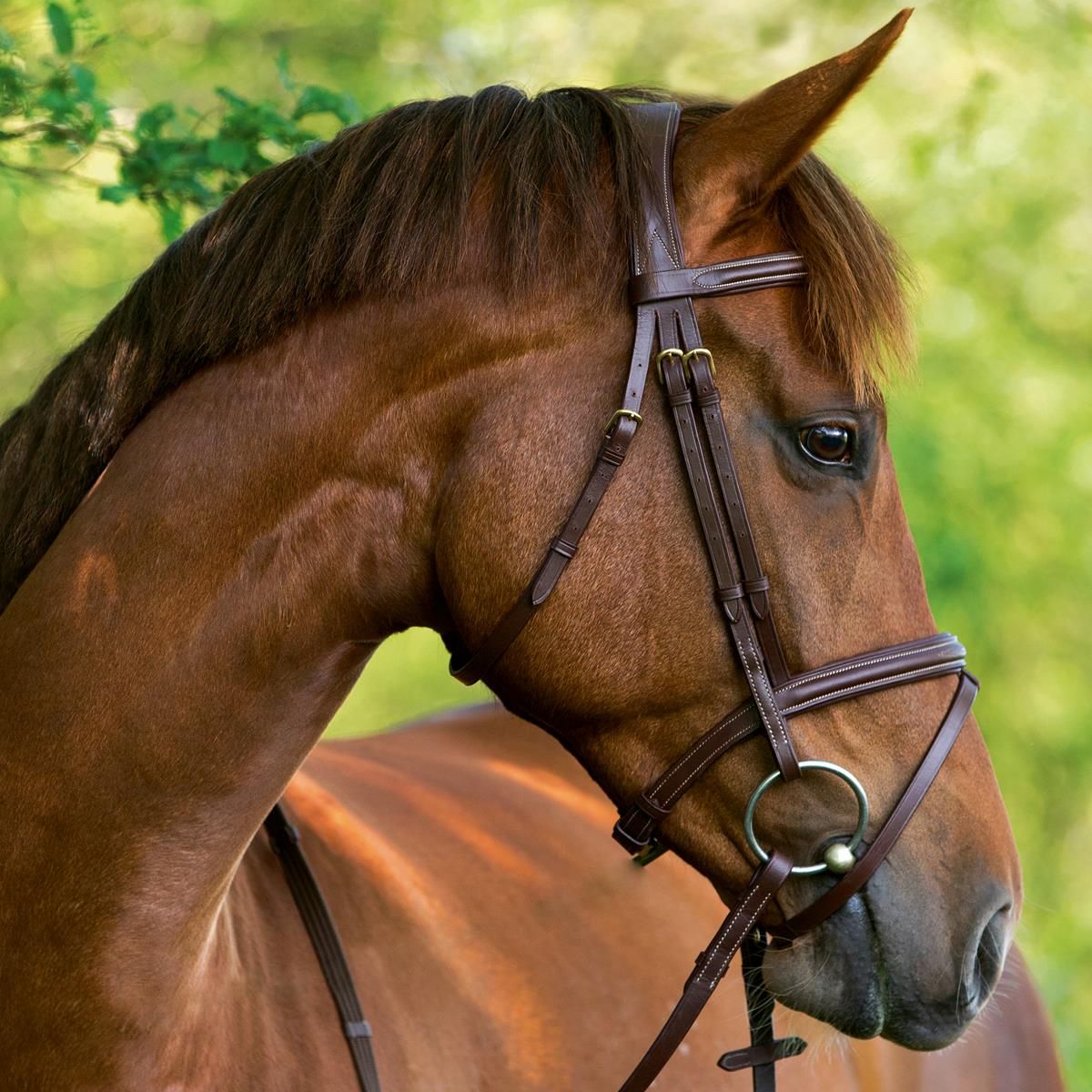 Denna vackra bruna träns i klassisk stil är tillverkad av högkvalitativt läder.