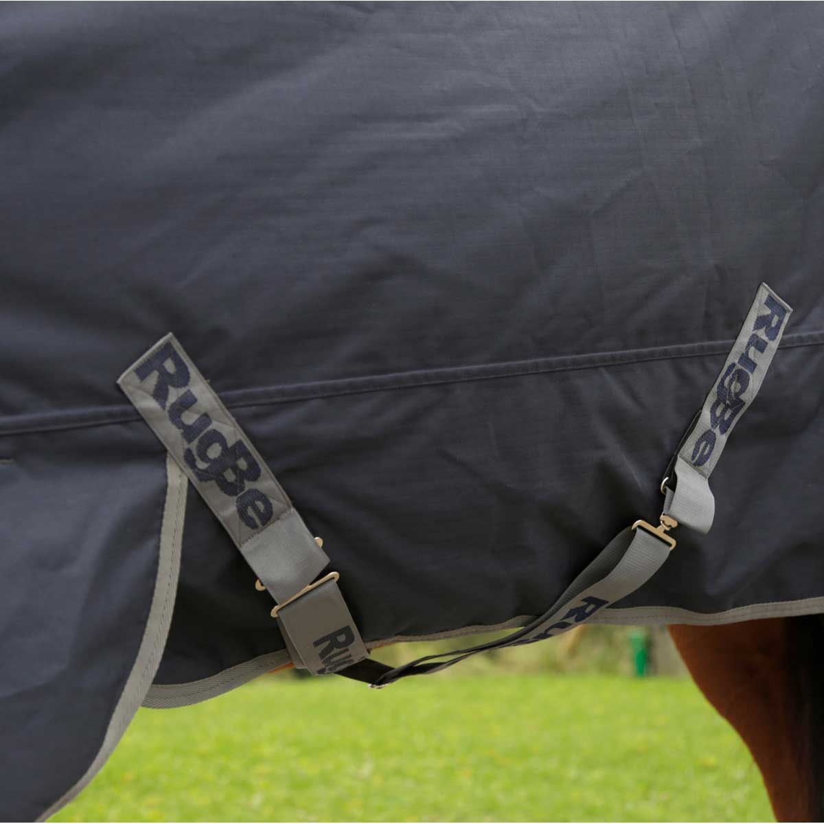Den här vinterhästfilten för våta och kalla dagar är fylld med värmande 300 g termisk fleece. Hästen hålls torr tack vare täcket, som också säkerställer temperaturutjämning (mycket vattenavvisande 3 000 mm, andningsbar 3 000 g/m²/24 h, 600 denier polyester). Den högkvalitativa och rivningsbeständiga regnmattan har ett behagligt innerfoder av polyester som inte skaver på pälsen. Vintermattan har en mycket bra passform och ytterligare RugBe-kuvert som ökar hästens rörelsefrihet. Svansbricka, elastiska bensnören och ryggradspolstring av syntetgummi, samt korsgjord på magen med elastiskt inlägg och ett överlappande bröstspänne med snabbspänne i metall och taggspännen är bara några av fördelarna med denna extremt praktiska allroundhästtäcka.