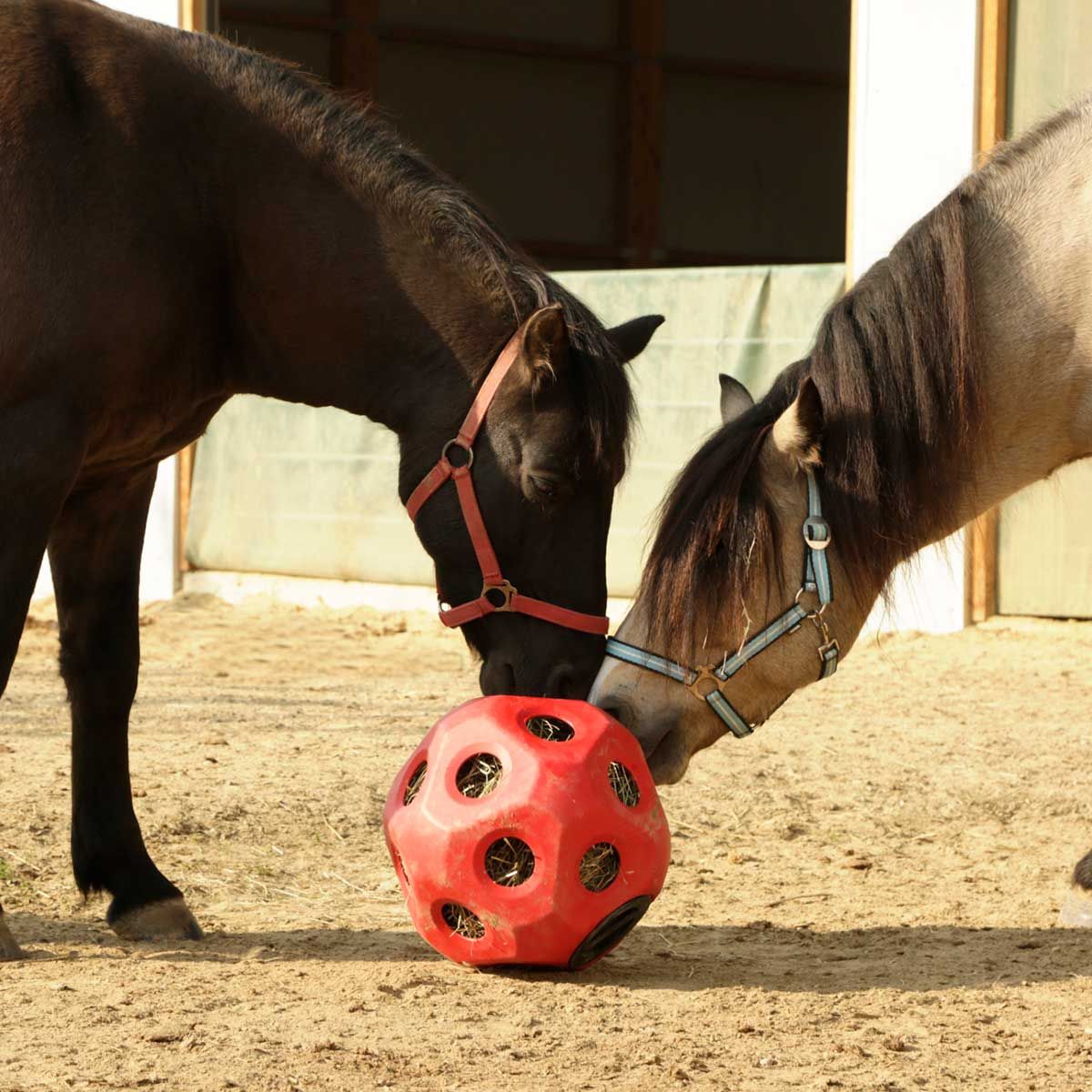 HayBoy passar perfekt för användning i stallet, på betesmarken eller i paddocken. Kalvarna eller hästarna kan plocka höet från 19 foderhål med en diameter på 70 mm vardera och hålls på så sätt sysselsatta. Den stabila, UV-beständiga plasten kan fyllas med upp till 3 kg hö. Fyllning är möjlig via 116 mm fyllningsöppning med skruvlock. HayBoy kan också hängas i ett rep eller en kedja, kalvarna gillar att sysselsätta sig med den svängande bollen.HeuBoy i en överblick