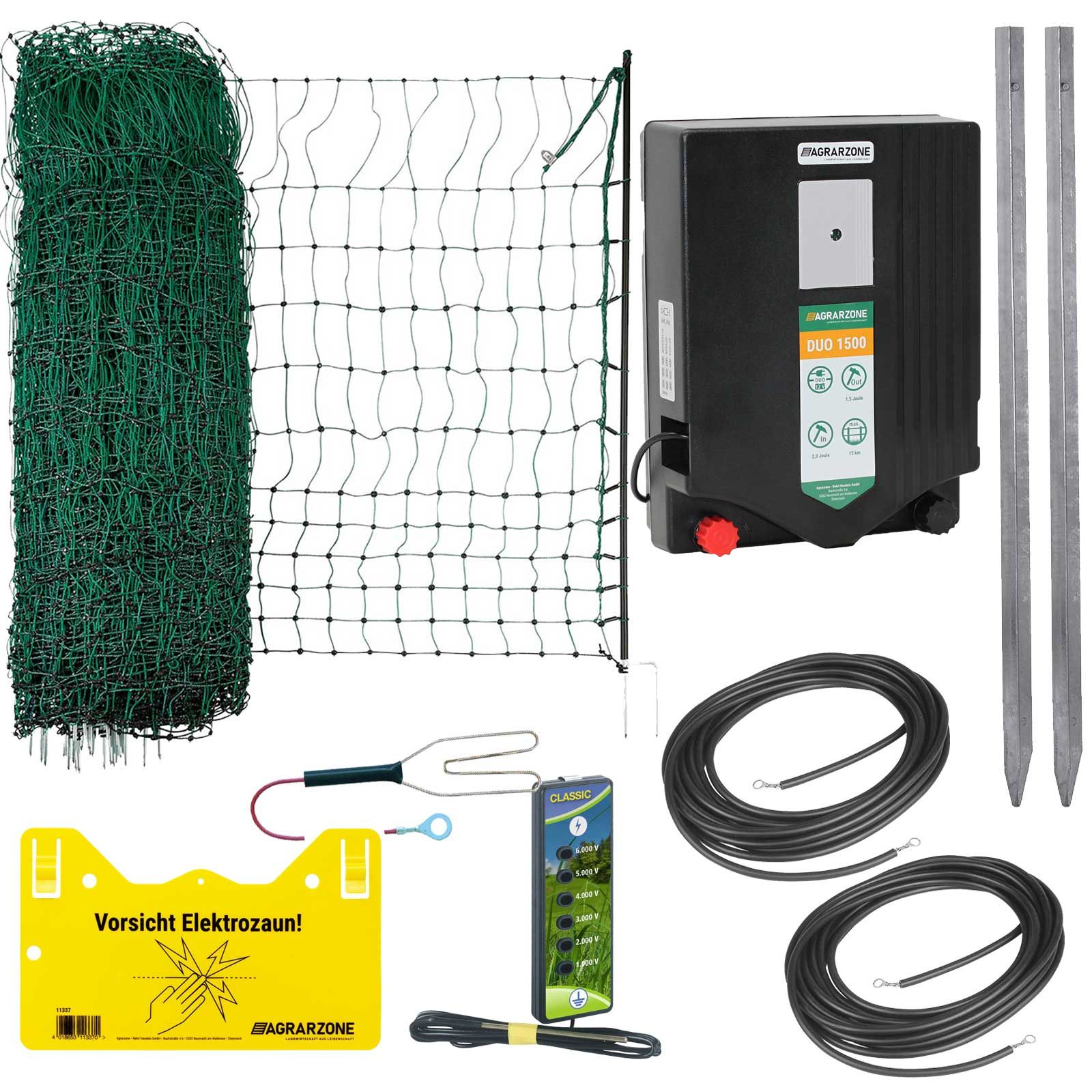 Den kompletta uppsättningen innehåller DUO 1500 betesstängsel, som har utvecklats speciellt för att effektivt avvärja vilda djur och rovdjur i dammar . Du kan driva fäktaren speciellt flexiantingen med 230 V ström eller med ett 12 V AGM-batteri (ingår inte). Utrustad med en LED-lampa för funktionskontroll har du alltid enhetens funktion och stängselspänning i åtanke. I setet ingår också ett 50 m långt och 65 cm högt, finmaskigt elektroniskt nät med stabil dubbel spets. Den dubbla spiken håller sig mycket bra i jordiga jordar. Fasta jordankare, jordstoppare och en strömlös, förstärkt jordkabel garanterar ett fast stöd och ett permanent optimalt strömflöde. Med de andra tillbehören som jordstång, kabel för anslutning av jord och stängsel, varningsskylt etc. har du allt du behöver för en snabb installation av ditt elstängsel.