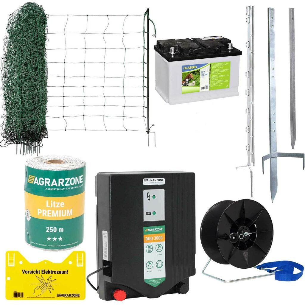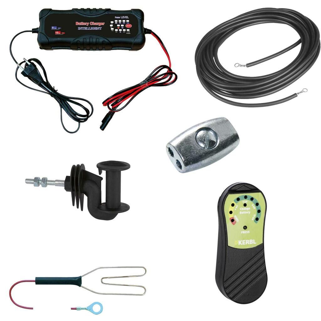 (inkl.: 1x anslutningskabel till stängslet, 1x jordkabel, 1x anslutningskabel 12V, 1x nätadapter 230V, 1x bruksanvisning). - 10x fårnät, 50 m, 90 cm, dubbla spikar, grönt, elektrifierande