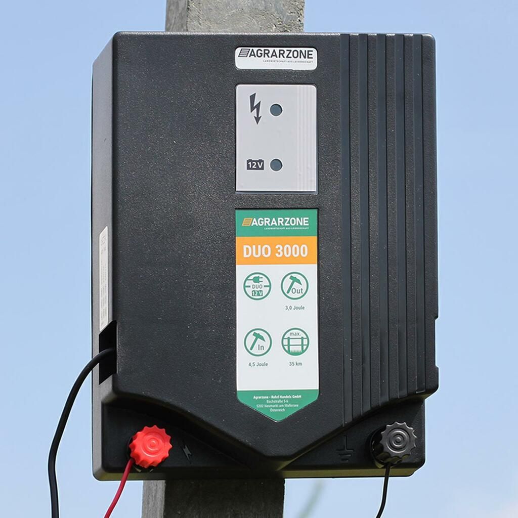 Elstängslet drivs av en högpresterande enhet för betesstängsel. Du kan använda DUO-enheten både stationärt med 230 V och särskilt flexibel mobilt med 12 V-batteri . För att garantera strömförsörjningen vid batteridrift innehåller nödutrustningen två batterier och en laddare. Tack vare de många användningsmöjligheterna kan en solcellsmodul på 25 watt också anslutas till betesaggregatet om det behövs. Detta gör den idealisk för lokal drift under huvudbetessäsongen samt för mobil användning på tillfälliga betesområden.